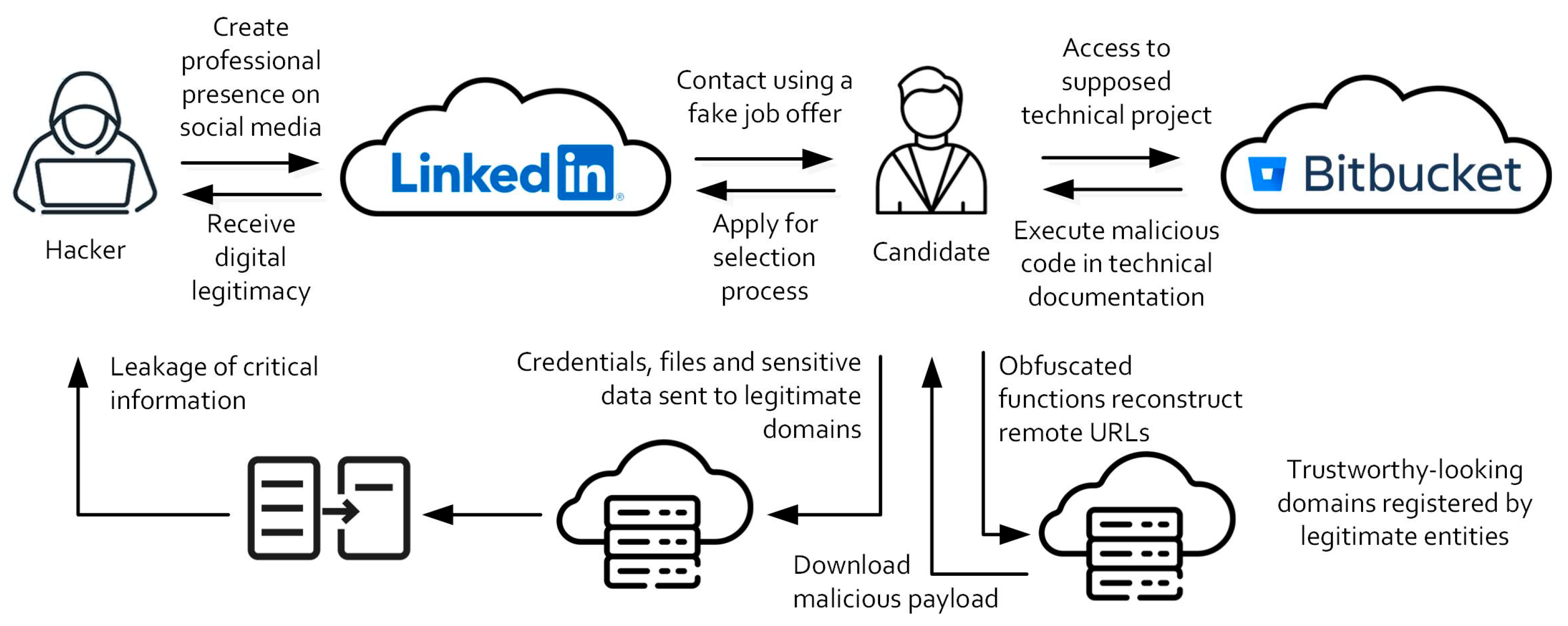 This section outlines the technical and procedural anatomy of a targeted social engineering attack disguised as a remote job interview. It presents the phases of interaction between entities, including the identity legitimization strategy, the delivery and execution of malicious code and the forensic analysis of its behavior. For reference, the attack model discussed in this section—had it not been detected in time—is illustrated in a clockwise sequence in Figure 1.