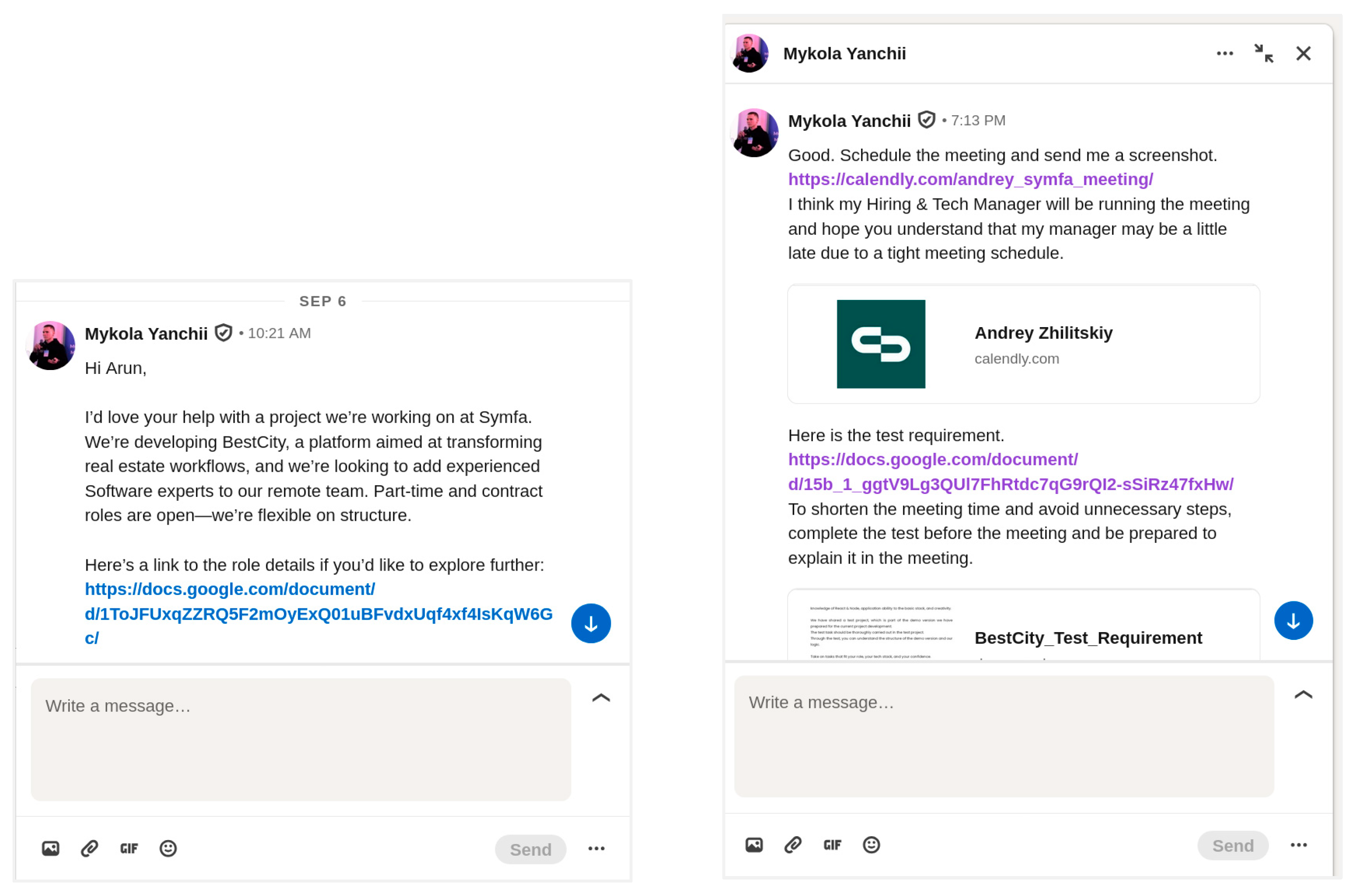 Conversation with target on LinkedInInvitation → urgent & operational instructionsPolite imperatives; concise, action-oriented statementsUrgency, friction reduction & formal process simulationReferences to roles (Hiring & Tech Manager), recognized tools (Google Docs, Calendly)Schedule a meeting; send a screenshot; complete the test; prepare the documentMeet (120.0), com (80.0), http (60.0), send (60.0), docs (40.0), google (40.0), schedule (40.0), time (40.0)The meeting will be run by our Hiring & Tech Manager; schedule a meeting; send a screenshot