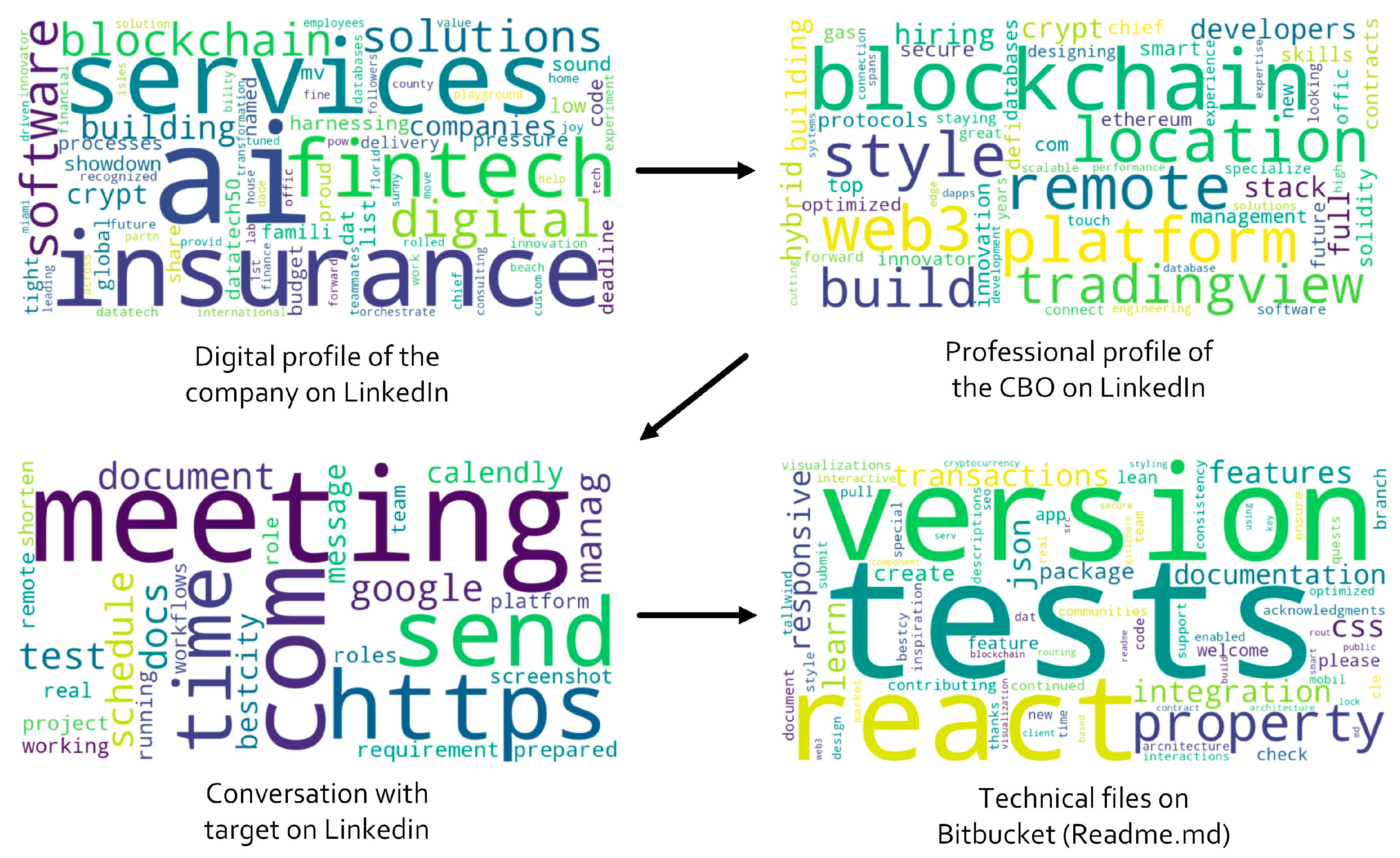 A detailed study on the frequency of keyword occurrences within the social engineering attack is presented in this section, enabling the identification of the predominant thematic focus across the different stages of the attack. To this end, web scraping techniques were employed and a spreadsheet was used to compile—after filtering out common terms such as articles, pronouns, adverbs and determiners—the 370 most frequently repeated words across four distinct sources: the company’s digital profile published on LinkedIn, the professional profile of the CBO also on LinkedIn, the conversation between the CBO and the candidate during the job interview and the help documentation hosted in the Bitbucket repository. This study facilitates the identification of linguistic patterns and recurring areas of interest.