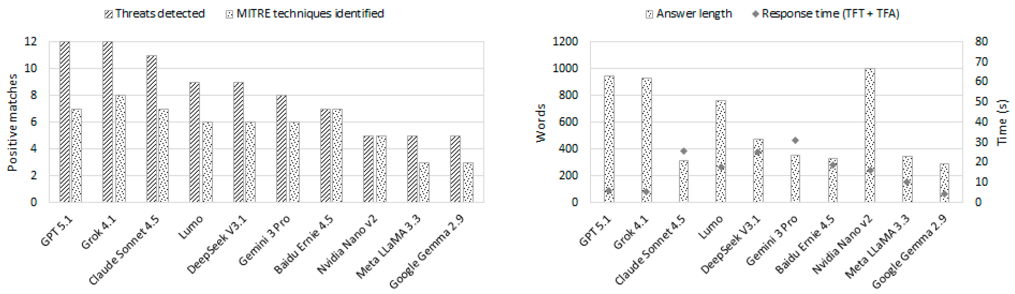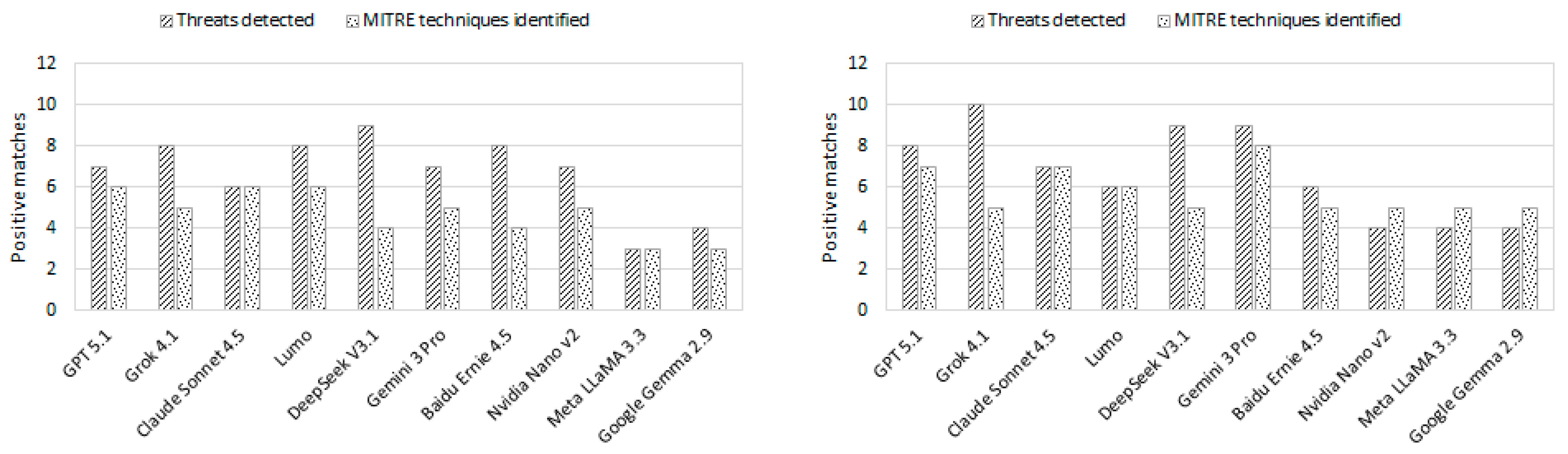 To complement the qualitative study presented in Table 5 and Table 6, a quantitative benchmarking analysis was carried out to provide standardized metrics for model performance. The evaluation was based on a ground truth of 12 confirmed threats embedded in the malicious code examined in this study. For each LLM, the number of correctly identified threats (true positives) was recorded, while false positives were not considered (FP = 0), which means precision remained at 100% for all models. Recall was calculated as the proportion of ground-truth threats detected by each model, and the F1-score was obtained as the combined measure of precision and recall. Table 6 presents these results for which all metrics are expressed as percentages for clarity. Grok 4.1 and GPT 5.1 detected the maximum number of threats (Recall = 100%; F1 = 100%), while Claude Sonnet 4.5 reached near-complete detection (Recall = 91.67%; F1 = 95.65%). Lumo and DeepSeek V3.1 identified nine threats (Recall = 75.00%; F1 = 85.71%), whilst Gemini 3 Pro detected eight (Recall = 66.67%; F1 = 80.00%). The remaining assistants—Baidu Ernie 4.5, Meta LLaMA 3.3, Google Gemma 2.9 and NVIDIA Nano v2—reported between five and seven threats, corresponding to recall values from 58.33% to 41.67% and F1-scores between 73.68% and 58.82%. These results provide a clear reference point for comparing the detection performance of different LLMs and introducing quantitative measures.