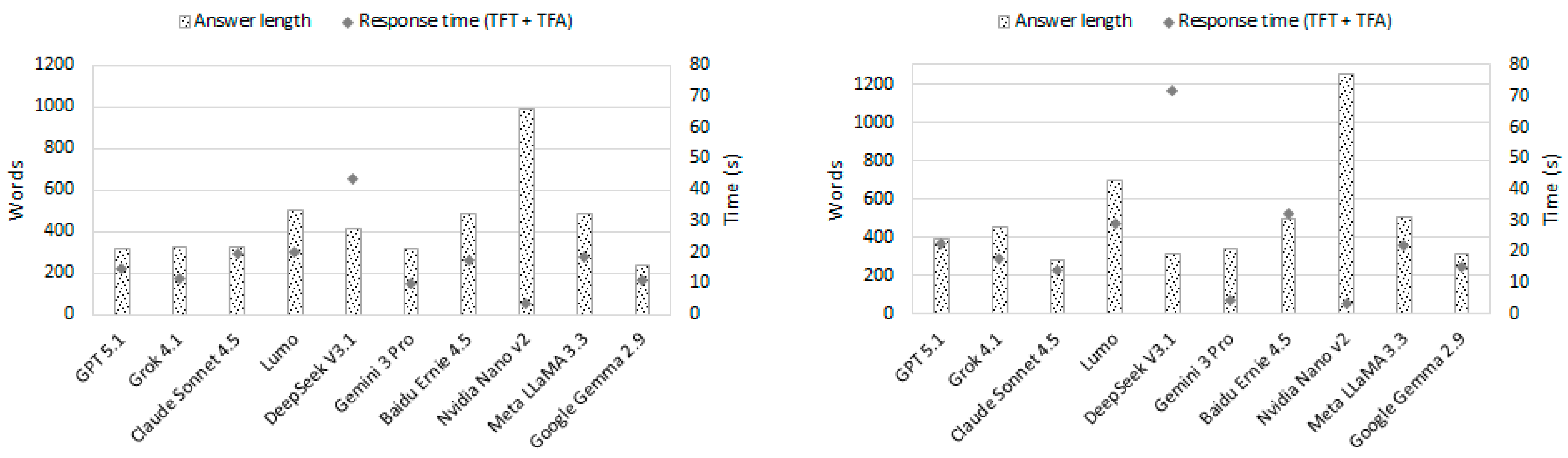The comparative analysis of times to full answer (TFA) obtained in the three scenarios defined by the type of prompt—operative, simple and technical—revealed a consistent pattern that reflects how the complexity of the query influences model latency. Operative prompts were the fastest with an average of 15.7 s (±9.3 s), followed by simple prompts at 16.6 s with a slightly higher standard deviation (±10.7 s), while technical prompts recorded the highest latency at 22.9 s and a significantly greater dispersion (±19.3 s). This progression reflects the semantic complexity and cognitive load that each prompt imposes on the model. Operative queries, although longer (580.4 ± 303.4 words), are oriented toward specific objectives (e.g., verifying suspicious code or wallet access), which reduces ambiguity and allows for more direct responses. In contrast, simple prompts, being generic, tend to produce shorter responses (439.4 ± 213.5 words) with warnings and caveats that extend generation time. Finally, technical prompts include terms such as obfuscated JavaScript, remote code execution and hidden payloads, which trigger exhaustive analysis and structured explanations, increasing both the length and variability of the response (506.3 ± 289.7 words). In summary, the study confirms that prompt complexity is a determining factor in the temporal dynamics of LLMs and that the growing dispersion in times reflects differences in the depth of analysis required. A detailed representation of answer length and response times can be seen in Figure 7 and Figure 9.