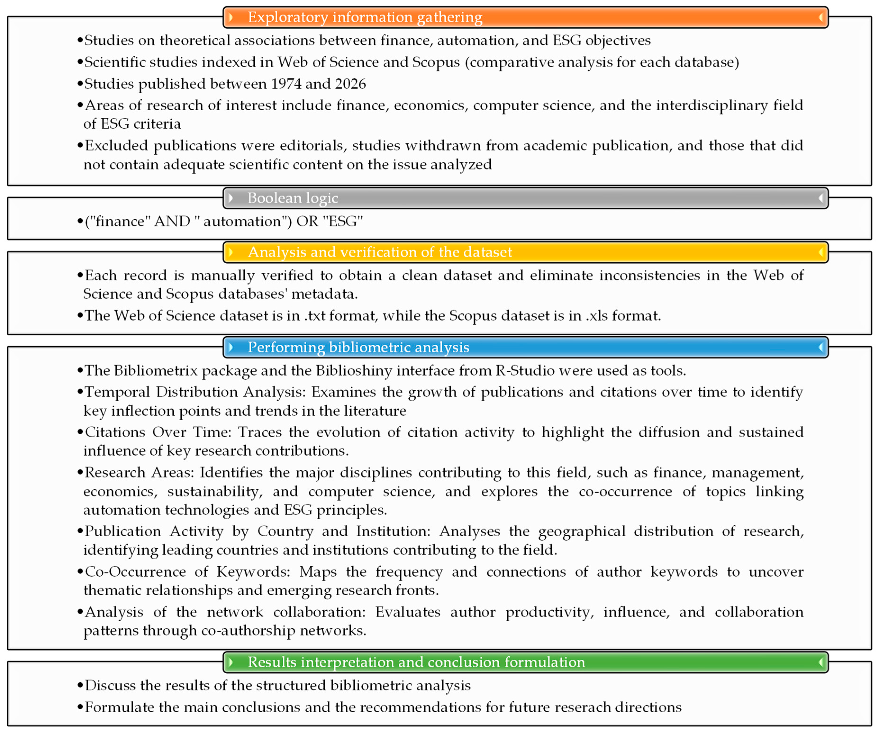 Specific bibliometric analysis methods are used to highlight the integrative nature of the three key concepts analysed: finance, automation, and ESG. Although these methods are widely used in the literature and are largely standardised, the contribution of this study lies not in methodological innovation per se, but in their integrated application to investigate the conceptual relationships between these fields.