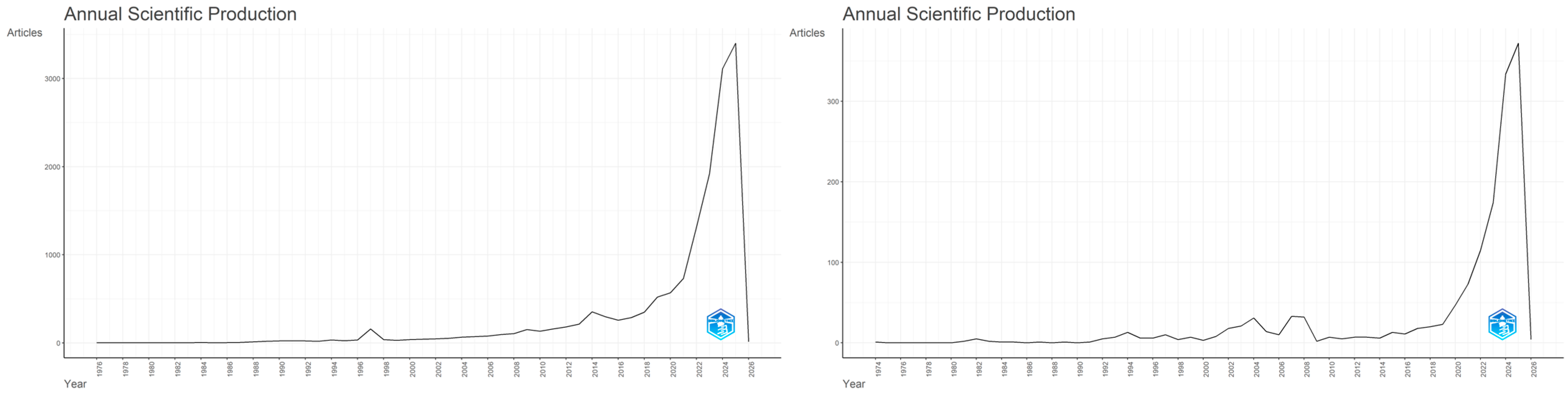 Moving forward, the analysis pursued the evolution and dynamics of the number of indexed publications in the two databases analysed from 1974 to 2026. The results, illustrated in