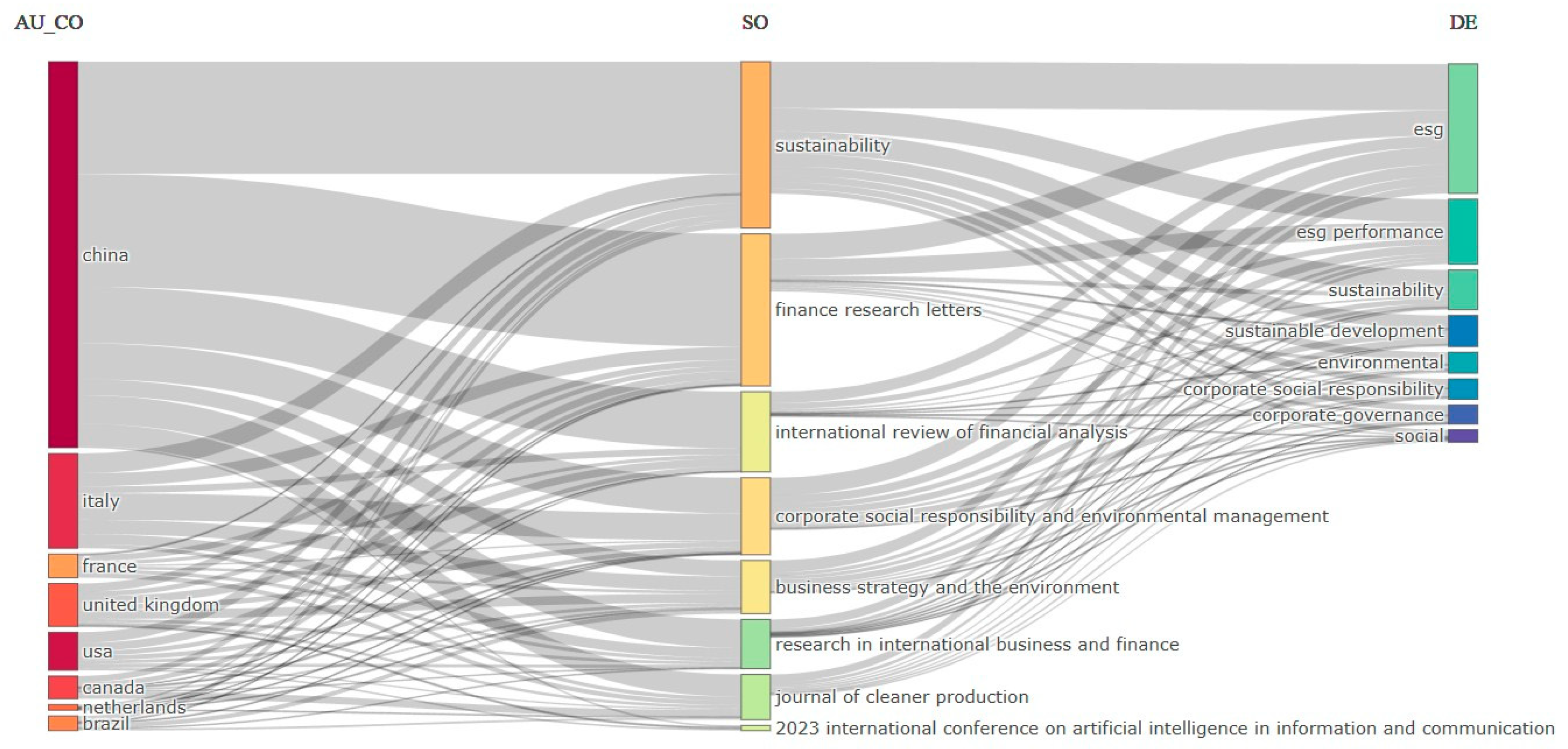 Another possible explanation is the synonym relationships between the search terms, particularly for the term “automation,” which can be associated with “digitization,” “digital,” “innovation,” “advanced data technology,” “artificial intelligence,” and so on, and for the term “ESG,” which can be associated with “environment,” “social,” “society,” “social footprint,” “sustainability,” “governance,” “environmental regulation,” “social regulation,” “environmental responsibility,” and “social responsibility.” We acknowledge this as a methodological limitation and will consider more elements and criteria for inclusion and exclusion in the final dataset for bibliometric analysis in future research directions.