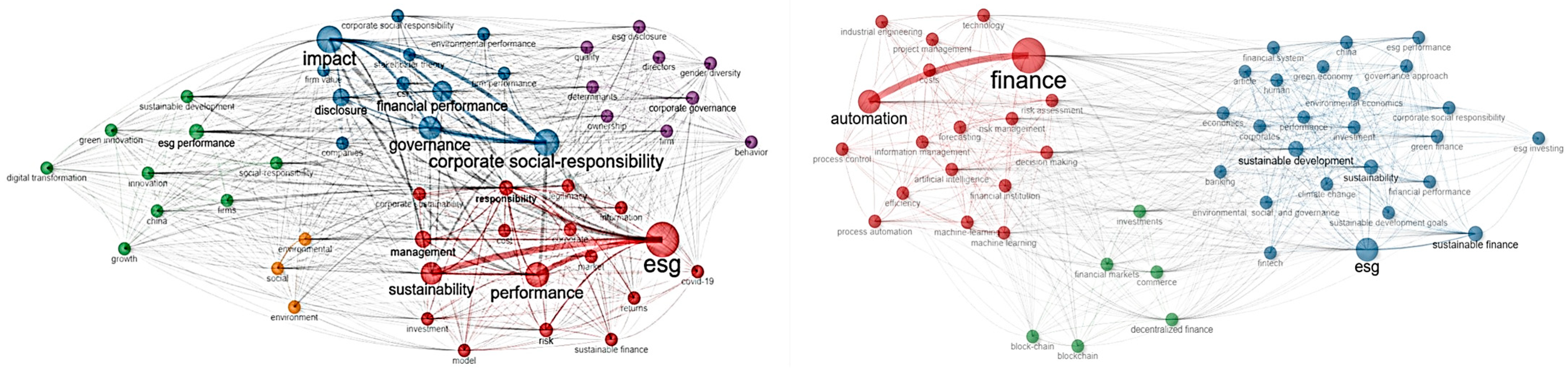 The bibliometric analysis in this study not only exposes theoretical trends regarding the connections between finance, automation, and ESG principles but also identifies specific issues to investigate in this new area of finance. Here, the integration of automation can generate positive aspects from the financial and economic ecosystem’s point of view, as well as challenges regarding compliance with ESG objectives. This information is presented in study [