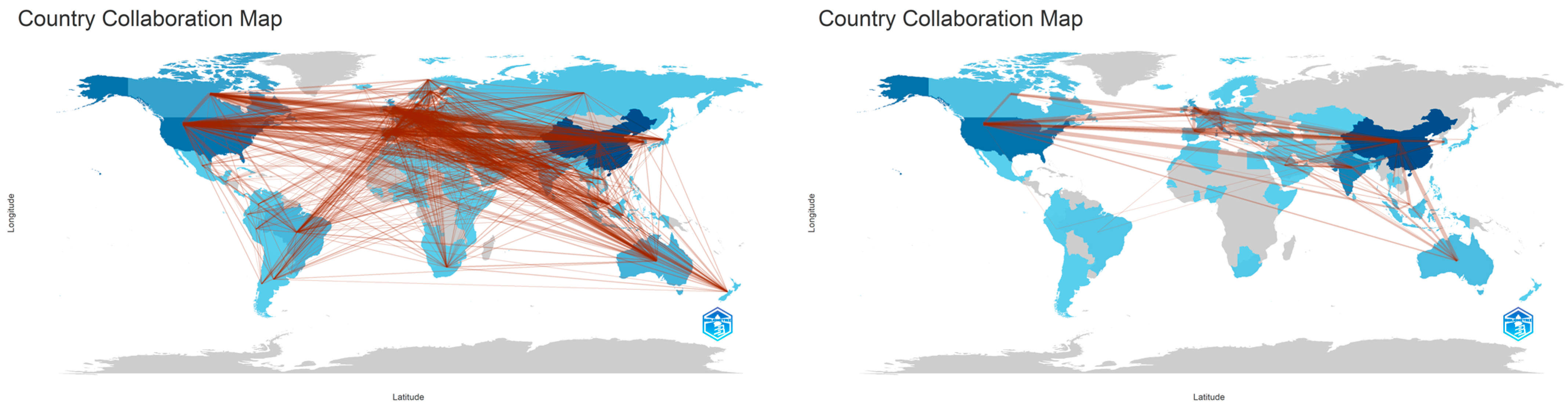 For instance, collaborations between European countries are highlighted by the blue cluster (France, Italy, Greece, Austria, and Switzerland), and collaborations between East and West Asian countries (India, Saudi Arabia, Pakistan, and Jordan) are specific to the red cluster.