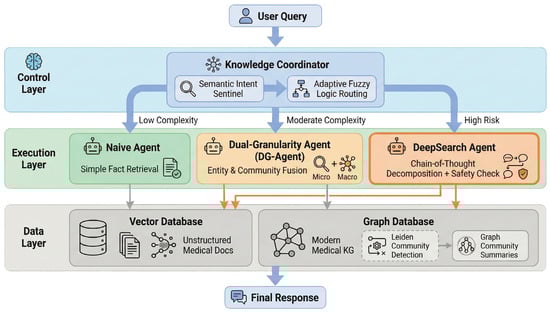 We first introduce the Knowledge Coordinator, which routes each query to an appropriate agent based on estimated complexity and safety risk. To address computational inefficiency and functional inadequacy arising from uniform retrieval strategies in traditional RAG systems when handling queries of varying complexity, a dynamic routing mechanism with a two-stage cascade design is introduced.