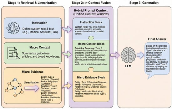 With micro evidence and macro summaries retrieved, the remaining challenge is to present heterogeneous graph structures in a Transformer-compatible form, which we address via knowledge linearization and hierarchical fusion. A fusion paradigm bridges the modal gap between structured graph data and unstructured text. As illustrated in Figure 5, the heterogeneous knowledge processing workflow comprises three sequential stages including parallel retrieval of macro-community summaries and micro-graph evidence, conversion of micro-graph structures into serialized natural language via a linearization protocol, and hierarchical fusion of linearized evidence and macro-summaries in-context.