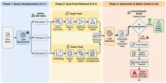 - Stage 1: Exact symbolic retrieval via KG. The system executes entity linking on the user query as the primary retrieval priority to map keywords to standardized entity nodes within the KG. Subsequently, the system utilizes the Cypher query language to retrieve direct attributes of these nodes from the graph database. This step enables high-fidelity structured knowledge extraction, reducing probabilistic errors inherent in model generation.