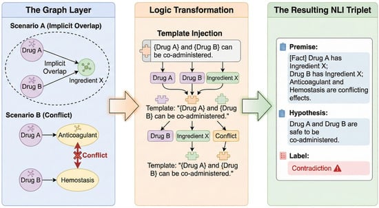 - Implicit Component Overlap: The system traverses graph data to identify drug combinations with distinct names mapping to the same active ingredient node (e.g., Tylenol and Yanlixiao Tablets both contain Acetaminophen). Component attribution relationships from the graph convert into natural language premises with contradictory hypotheses suggesting concurrent use. This mechanism enables the model to identify risks of chemical component superposition beyond commercial drug names.