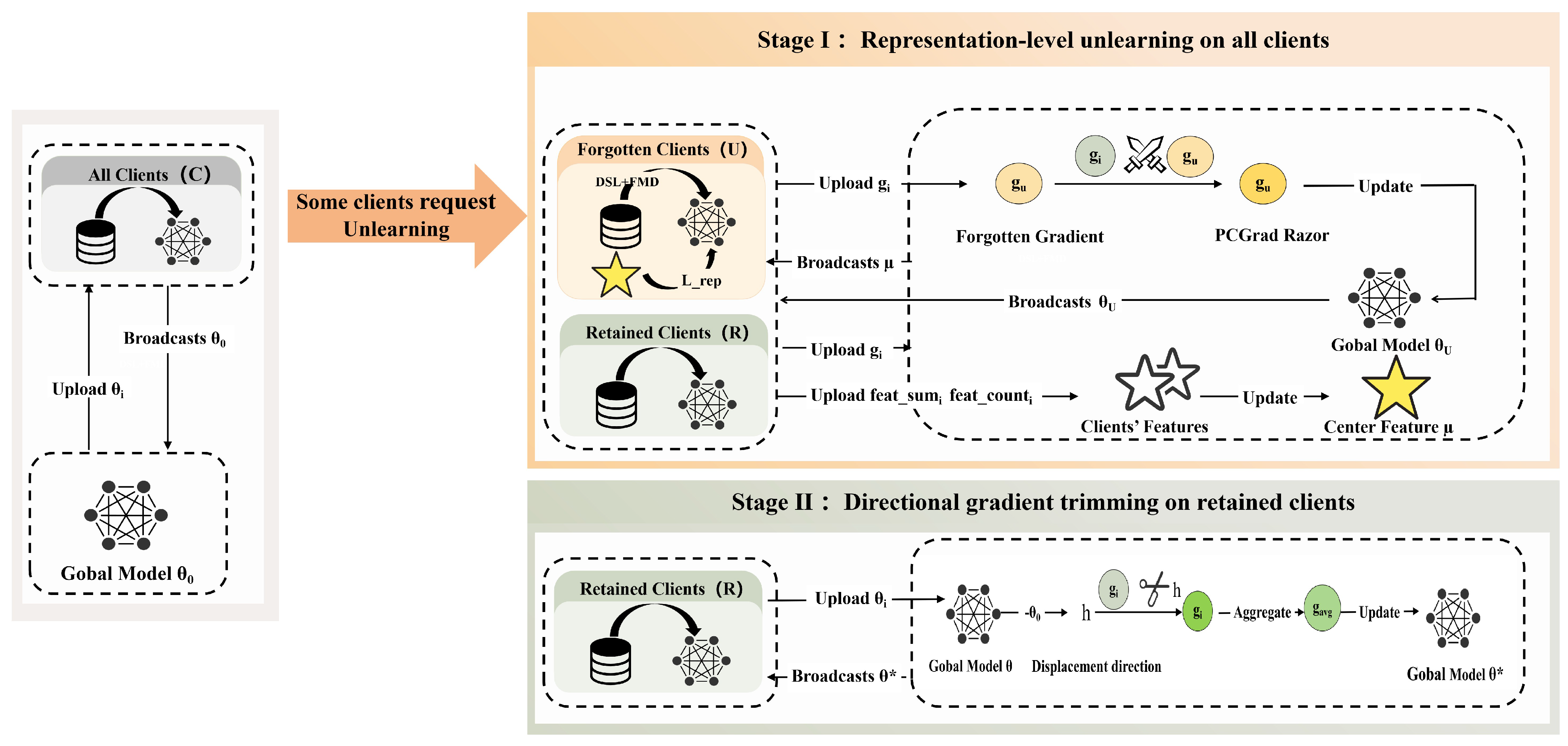 - Zhao, S.; Zhang, J.; Ma, X.; Jiang, Q.; Ma, Z.; Gao, S.; Ying, Z.; Ma, J. FedWiper: Federated Unlearning via Universal Adapter. IEEE Trans. Inf. Forensics Secur. 2025, 20, 4042–4054. [Google Scholar] [CrossRef]