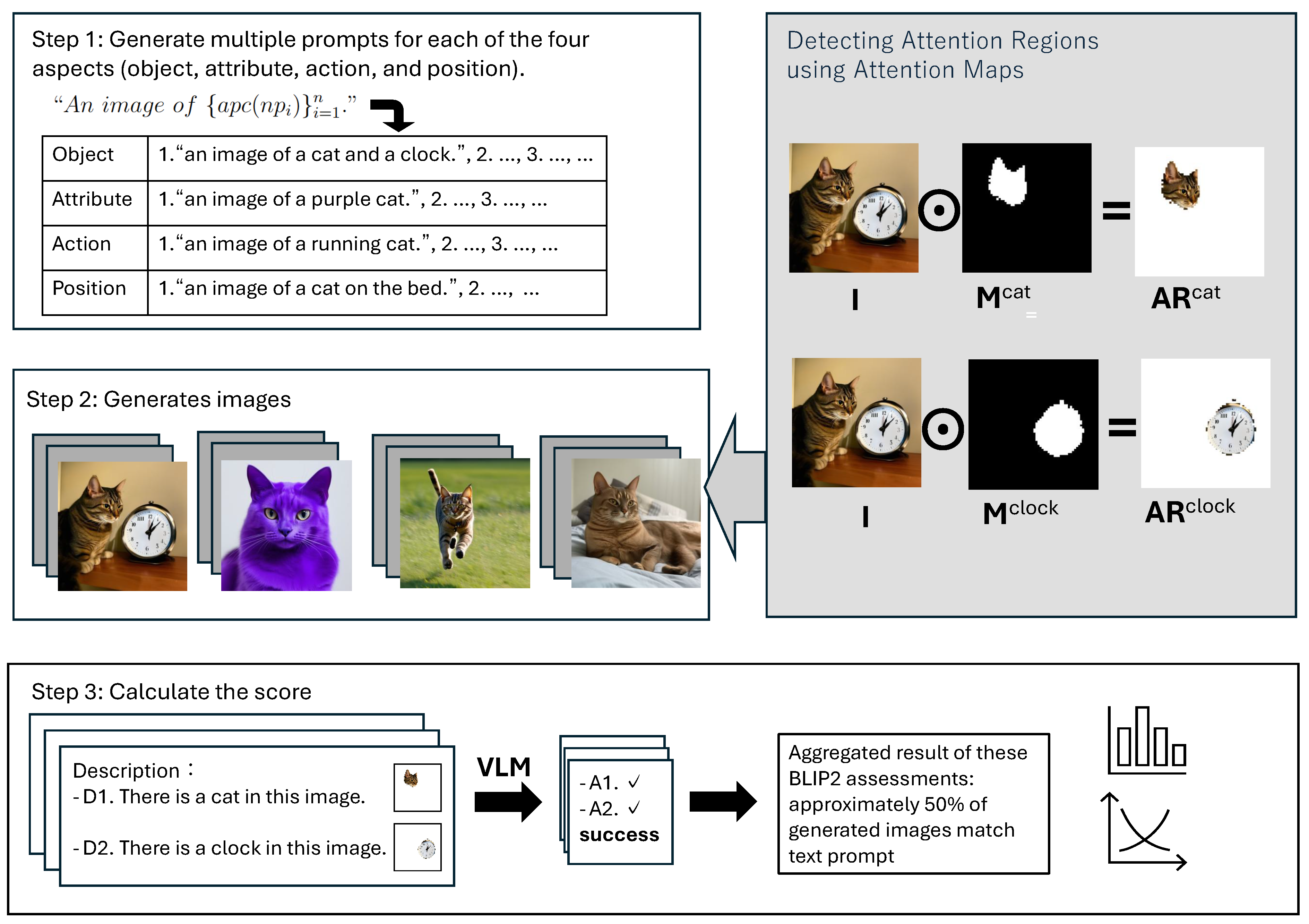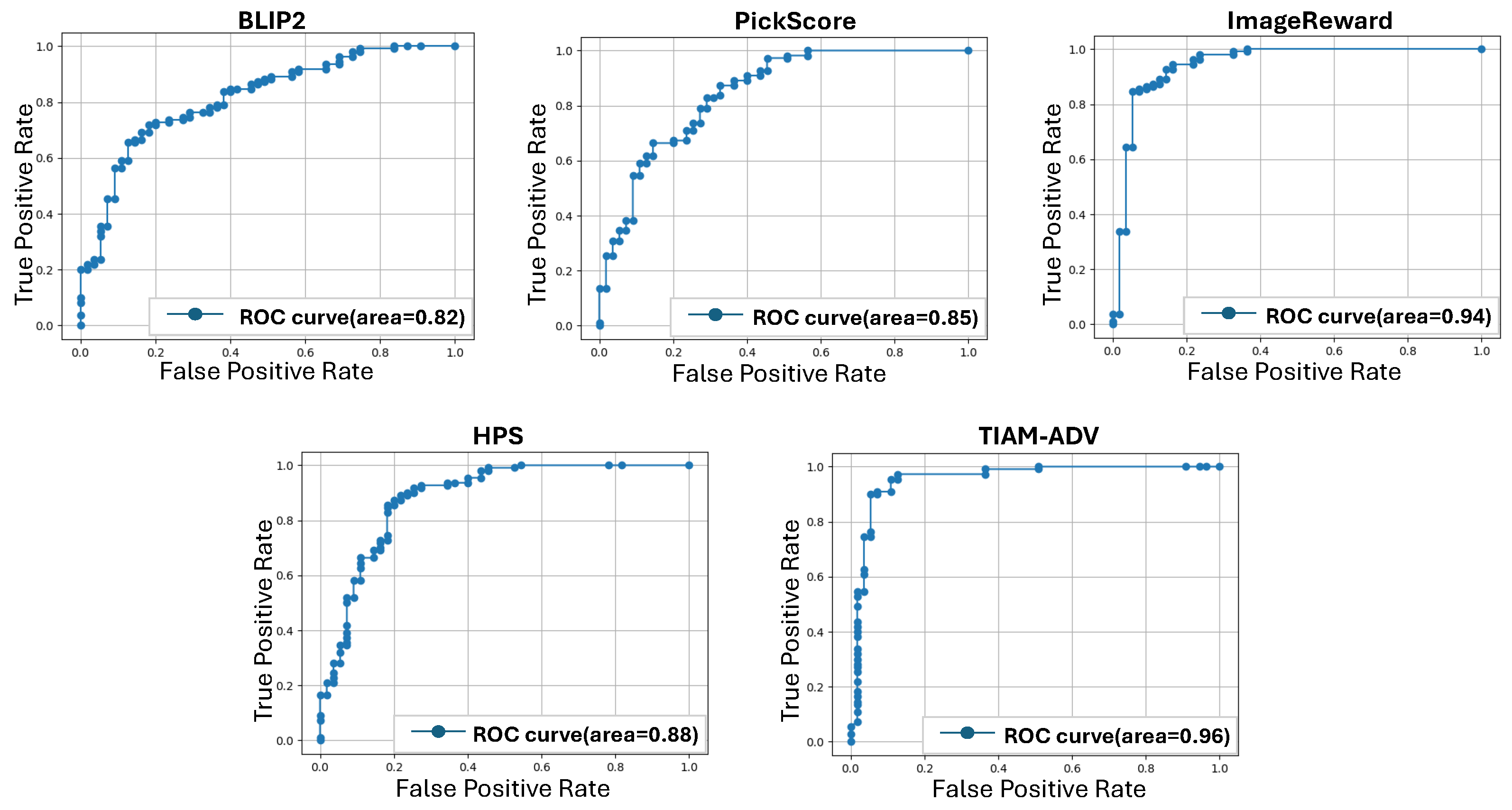 Figure 6. Among them, TIAM-ADV achieved the highest predictive performance, with an area under curve (AUC) of 0.96, slightly exceeding ImageReward and outperforming other metrics. Unlike ImageReward, our method does not require additional training of the VLM, providing greater flexibility. Notably, TIAM-ADV also outperformed BLIP-2 (AUC 0.82) and exhibited a stronger correlation with human judgment, highlighting the effectiveness of its attention region extraction of tokens, which distinguishes it from BLIP-2. This confirms that the attention maps are sufficiently informative for the evaluation task considered in this work.