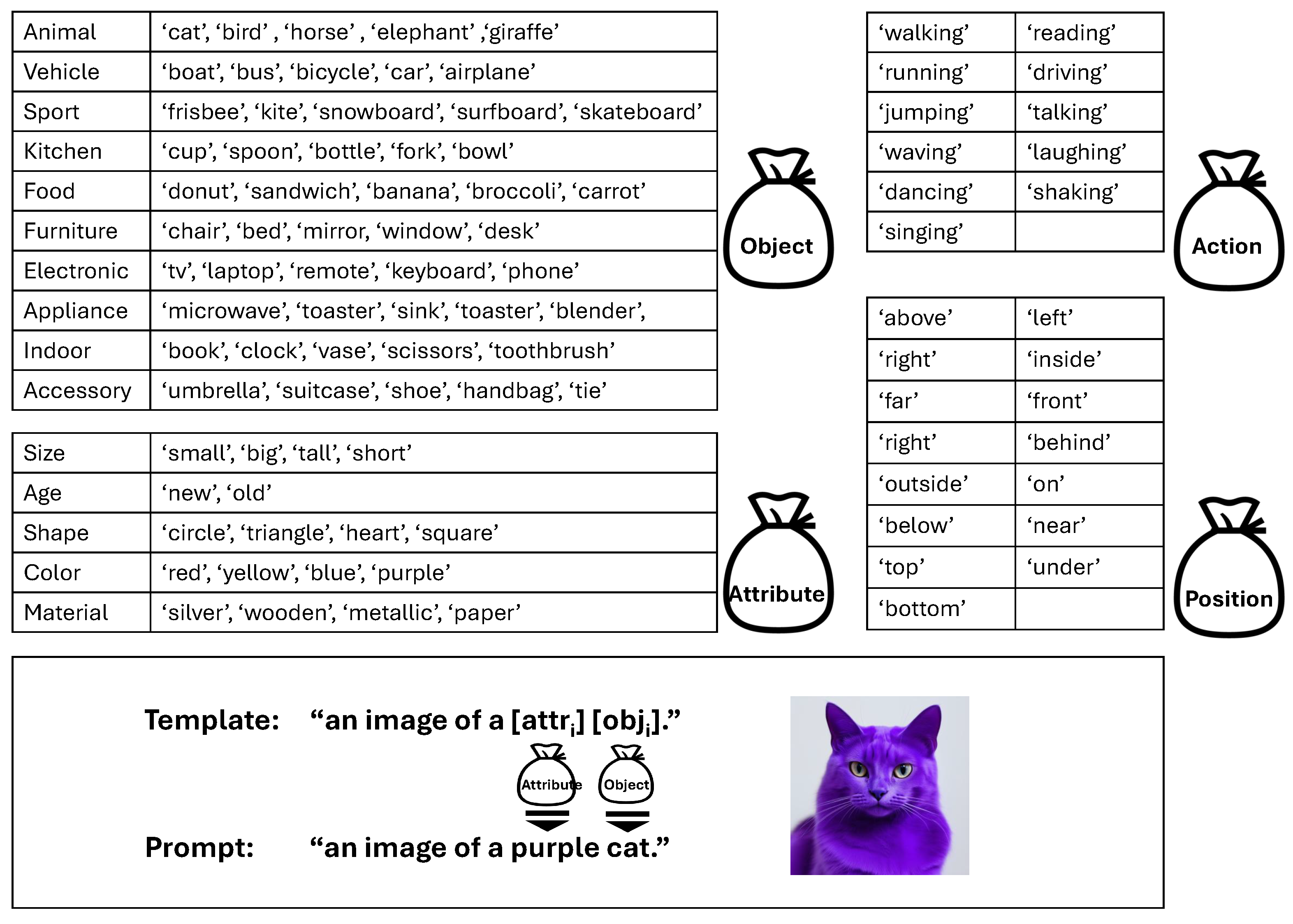 To evaluate the ability of the models to generate images depicting the spatial relationships between objects, we considered prompts of the form “an image of apc(),” where and are from the and sets, respectively, and ∈ {‘chair’, ‘bed’, ‘mirror’, ‘door’, ‘desk’ }. We obtain 300 prompts from all possible combinations after filtering out unnatural expressions.