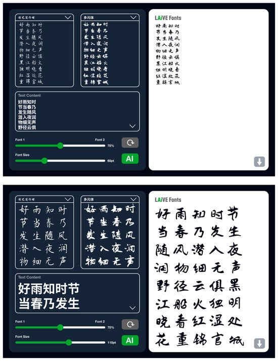 User interface of the co-creative font generation system, showing real-time parameter adjustment and glyph preview. In the image, users adjust the sliders for Font 1 and Font 2 to control font weight and size, while the AI generates corresponding typeface variations based on the input values. The content of the generated Chinese font is Happy Rain on a Spring Night, a classic poem by Du Fu, a Tang Dynasty poet of China. This poem depicts the revival of all things in the spring night rain scene and the longing for a vibrant life.