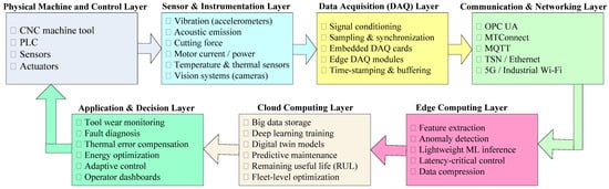 Studies show clear differences in performance when comparing centralized, cloud-based DAQ systems to those that use edge computing. Cloud-based data acquisition systems often have end-to-end latencies of several hundred milliseconds [15,27,30]. This is due to data transmission and centralized processing, which makes them less suitable for applications that require real-time monitoring and control [15,76]. Conversely, edge-enabled DAQ systems, which conduct local preprocessing and feature extraction, have demonstrated the capacity to diminish effective latency to less than 50 ms [78]. This reduction facilitates near-real-time anomaly detection and adaptive compensation within high-speed CNC machining applications [30]. Synchronization precision, as reported, frequently falls within the microsecond range when employing hardware triggering or network-time protocols. Throughput, however, is contingent upon the specific sensor modality and its corresponding sampling rate; for instance, high-frequency vibration and acoustic emission signals necessitate continuous data rates spanning from tens to hundreds of kilohertz [15,78].
