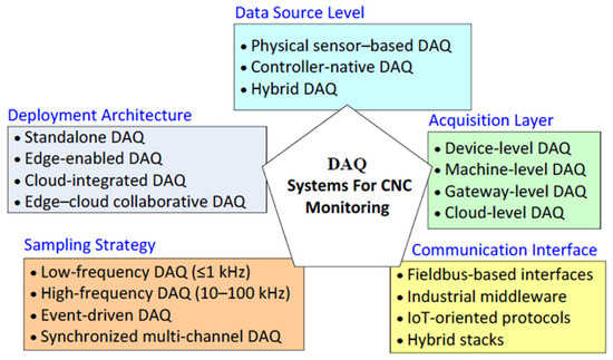 Data acquisition (DAQ) systems serve as a critical interface between real CNC machine tools and upper levels of monitoring, analytics, and cloud intelligence. Cloud-enabled CNC condition monitoring through a system of DAQ is charged with the dependable, high-fidelity acquisition of various heterogeneous signals such as vibration, force, current/temperature, and acoustic emissions, as well as with temporal synchronization, scalability, and seamless interoperability with edge–cloud architecture [15,27,75,76]. Modern data capture systems should enable the simultaneous collection of raw data as well as real-time preprocessing, compression, buffering, and transferring of the data to downstream systems such as digital twins, predictive maintenance engines, and cloud analytics frameworks [27,30,77]. The growing popularity of high-frequency sensing beyond tens of kilohertz underscores the necessity of superior designs for DAQ systems that can accommodate large volumes of data without the loss of packets or other latency-induced degradations [15,78]. In accordance with the literature review, a CNC monitoring system in the form of a DAQ system can be relevantly structured around five complementary dimensions, namely, data origin, layer at which the data is captured, sampling nature, communication interface, and general deployment architecture. Not only does this taxonomy offer a basis on which previous works can be compared, but it also offers a foundation on which the cloud–edge integration solutions in Section 5, Section 6 and Section 7 will be formed. Figure 4, below, is a summary of the said taxonomy.