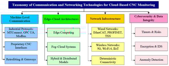 Figure 5 shows a hierarchy of the taxonomy of the available communication and networking technologies applied in cloud-based CNC monitoring. This taxonomy consists of machine-level protocols, edge–cloud architecture, network infrastructure, cybersecurity methods, and new paradigms. It gives a coherent conceptual framework, which forms the basis of the in-depth discussion in Section 4.2, Section 4.3 and Section 4.4.