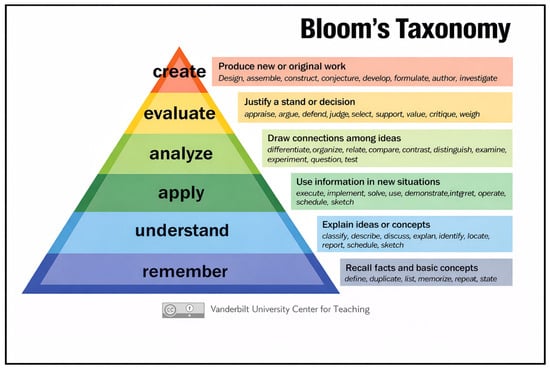 - Krathwohl, D. A Revision of Bloom’s Taxonomy: An Overview. Theory Into Pract. 2002, 41, 212–218. [Google Scholar] [CrossRef]