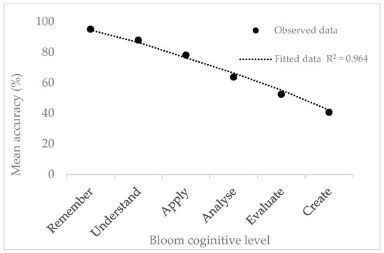 The aggregated data from 110 evaluated responses revealed a clear negative relationship between Bloom’s cognitive level and ChatGPT’s performance accuracy. Figure 2 (accuracy vs. Bloom level) illustrates a smooth downward curve, with a coefficient of determination R2 = 0.96, signifying that nearly 96% of the variance in mean accuracy can be explained by the increasing cognitive complexity of the task.