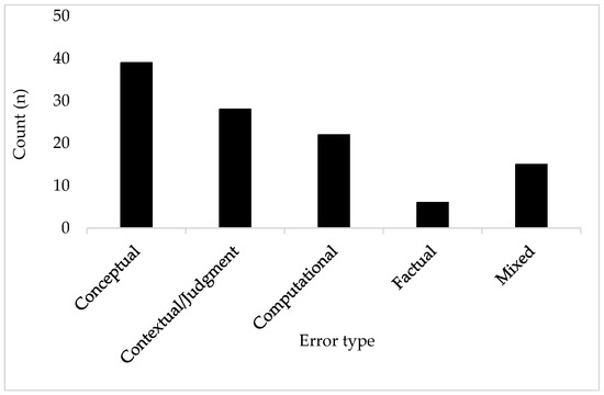 To characterise the nature of ChatGPT’s limitations across cognitive levels, all responses were coded into four primary error categories—factual, computational, conceptual, and contextual/judgment—with an additional “mixed/ambiguous” category used when multiple error types co-occurred. Figure 3 shows the distribution of error types across all responses.