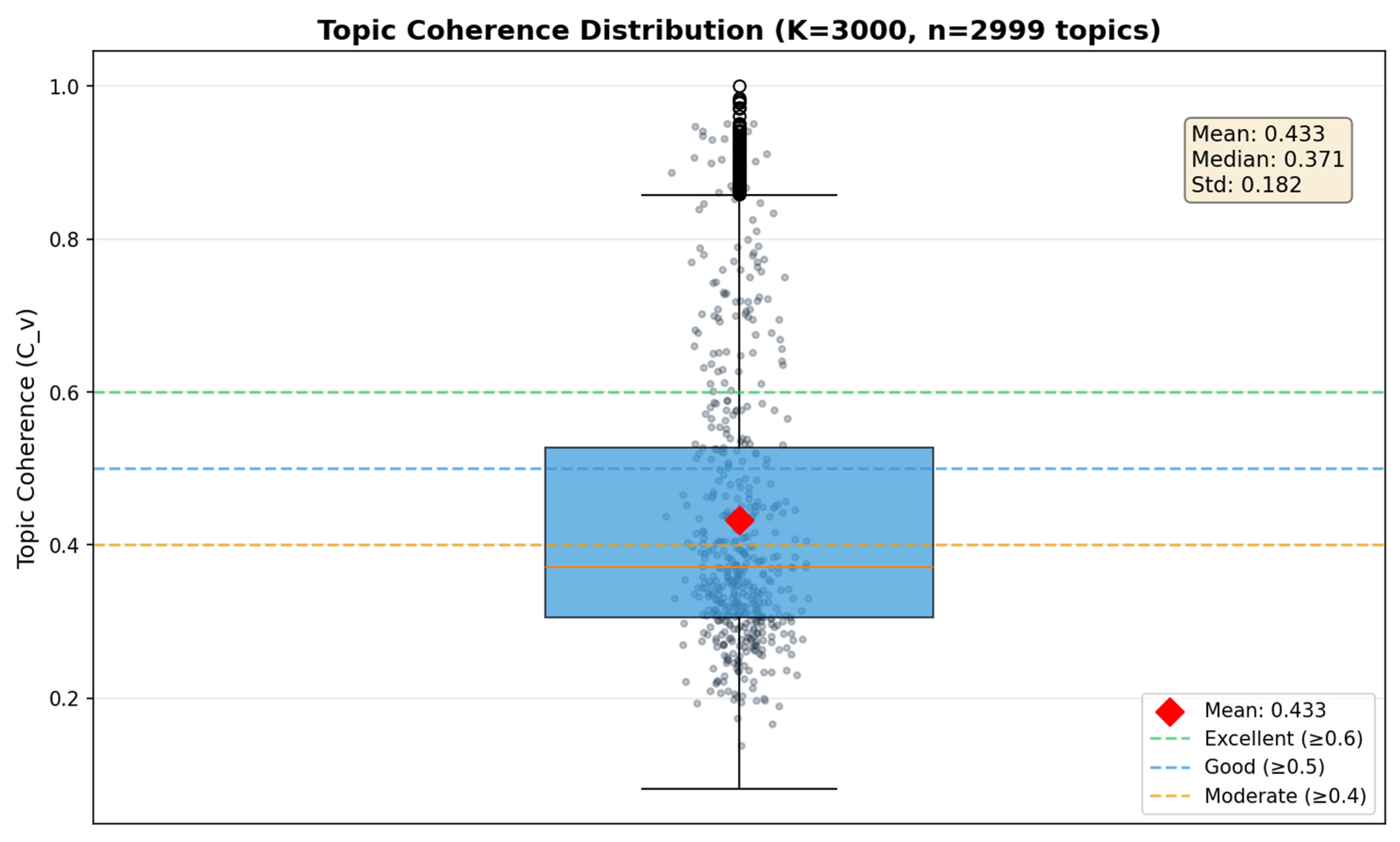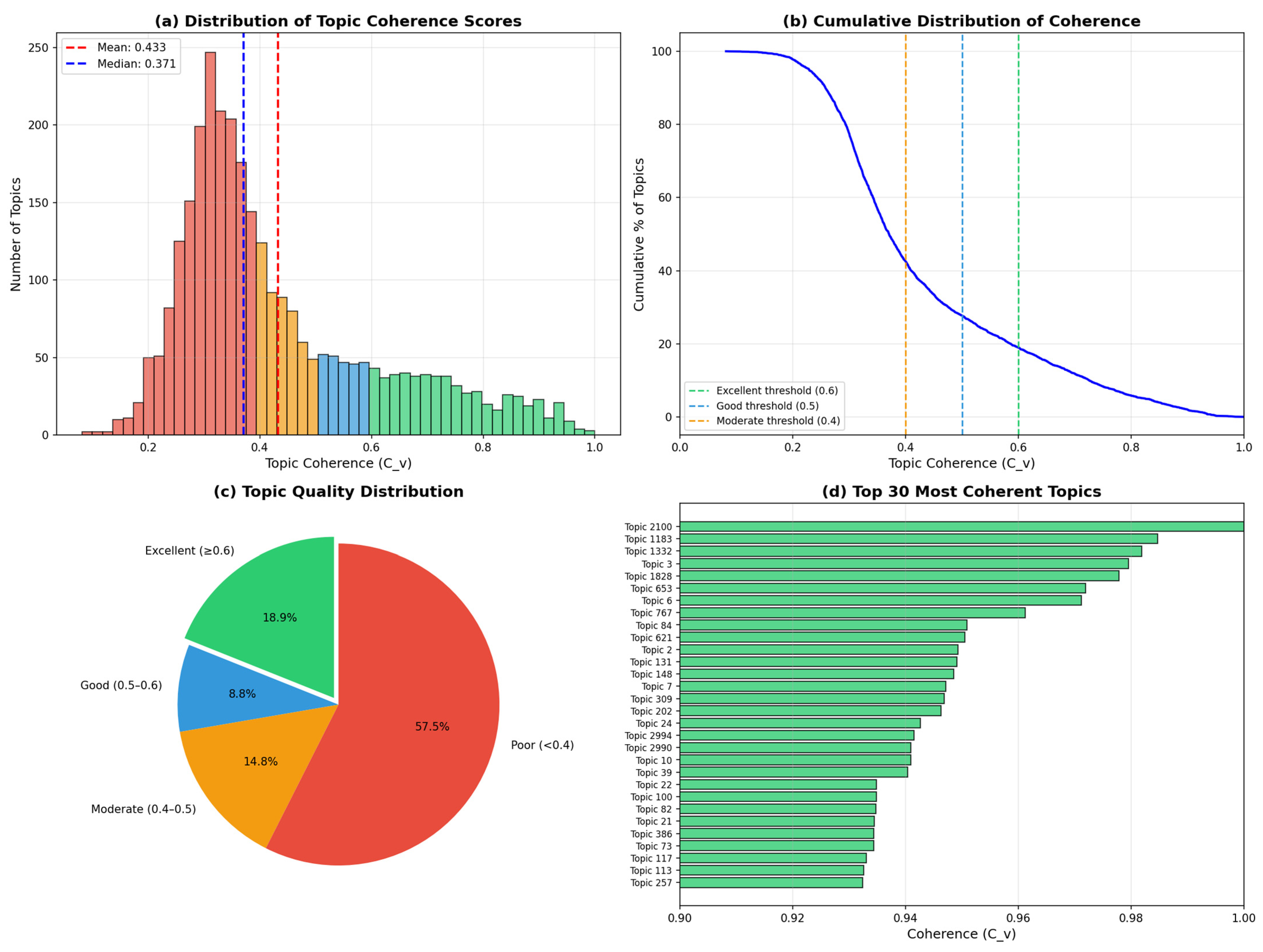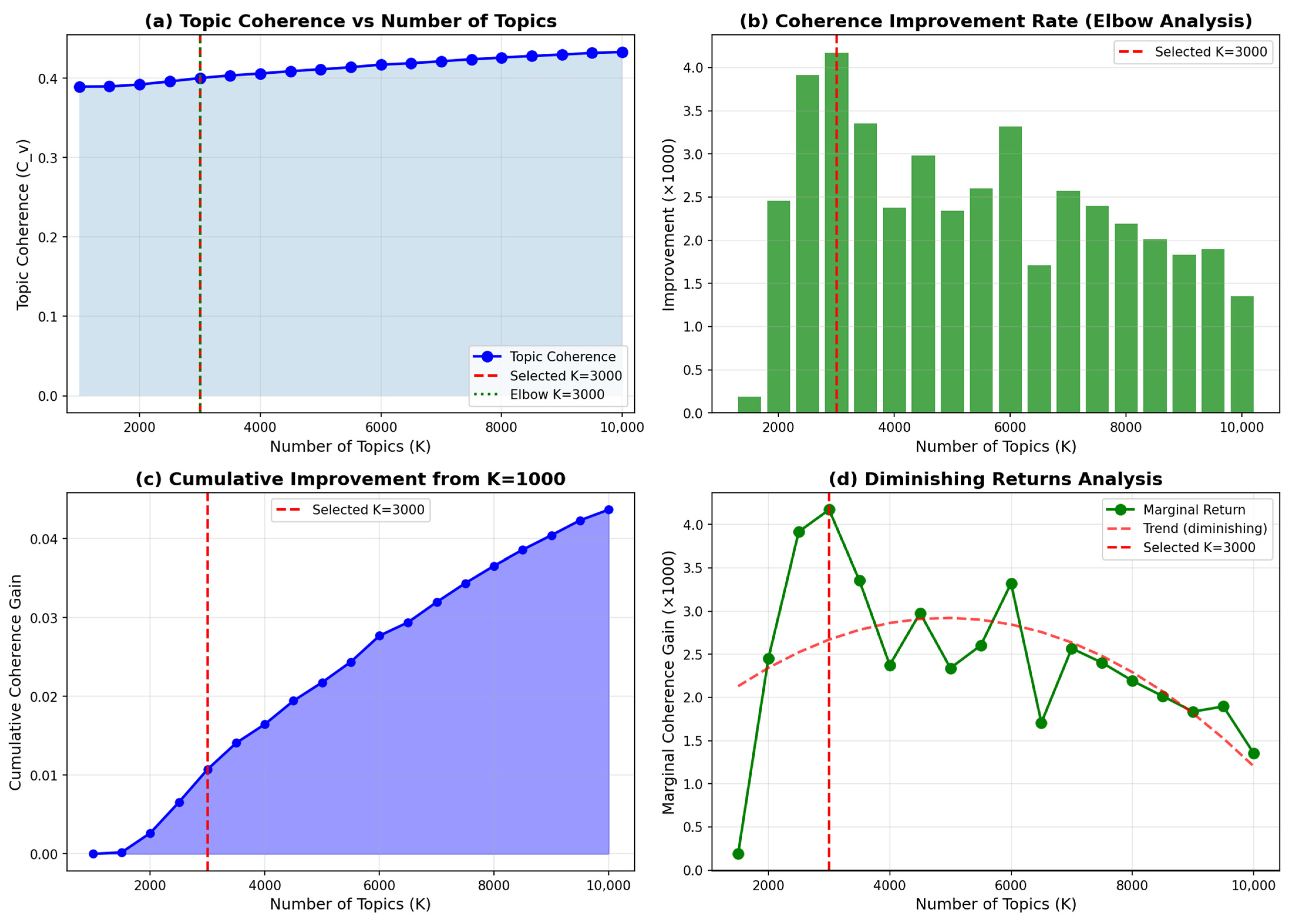 | K | Coherence (C_v) | Num Topics | Docs per Topic | Improvement (%) |