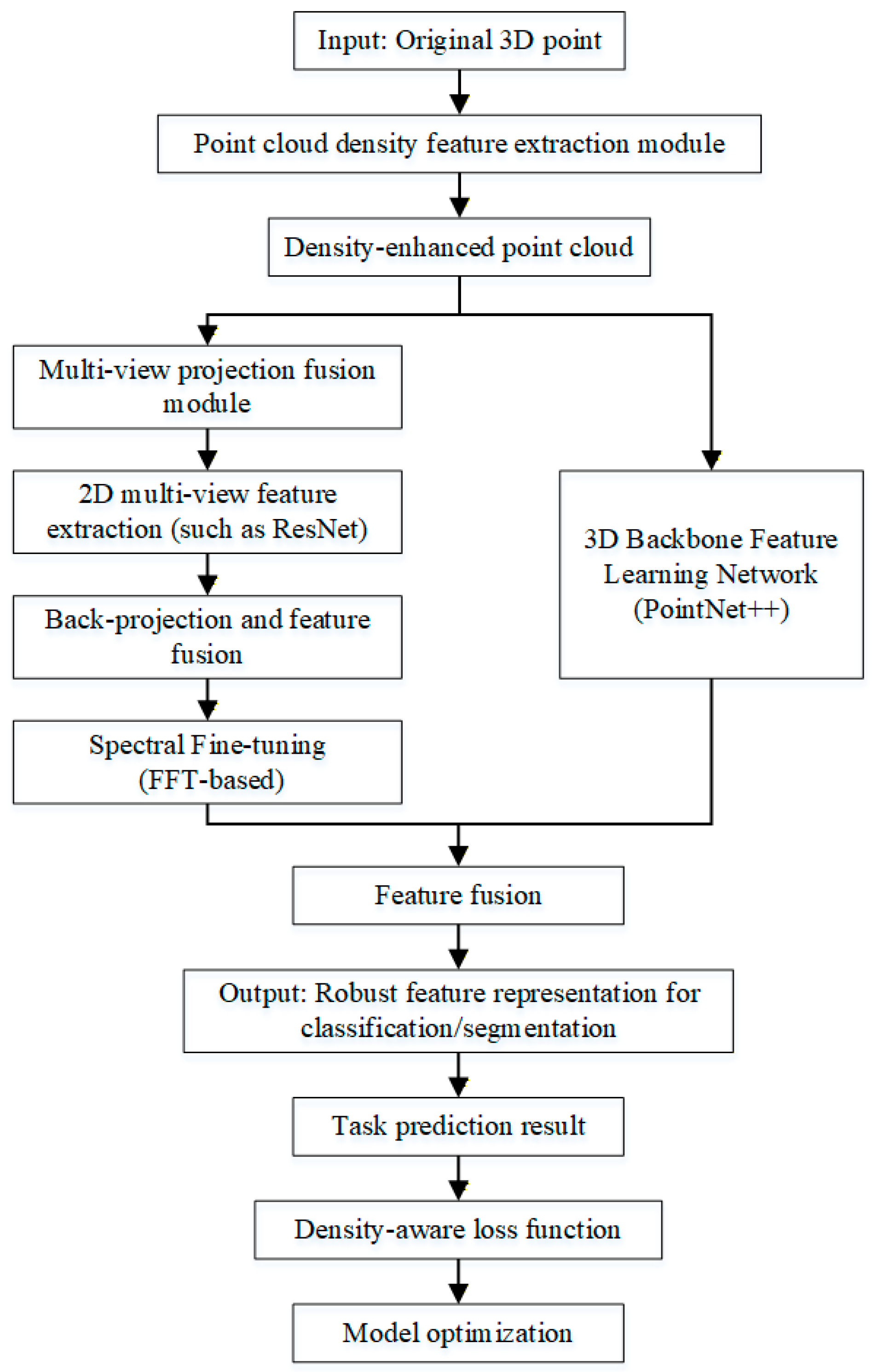 In summary, existing 3D point cloud analysis methods have significant limitations in density perception, multi-source information fusion, and targeted optimization of loss functions when dealing with scenes with uneven density. To overcome these shortcomings, this paper proposes an innovative framework that integrates density-adaptive feature enhancement and lightweight spectral fine-tuning, aiming to comprehensively improve the feature representation robustness and classification accuracy of the model in challenging scenarios such as sparsity and occlusion by explicitly injecting density information, fusing multi-view complementary features, and introducing density-aware optimization objectives.