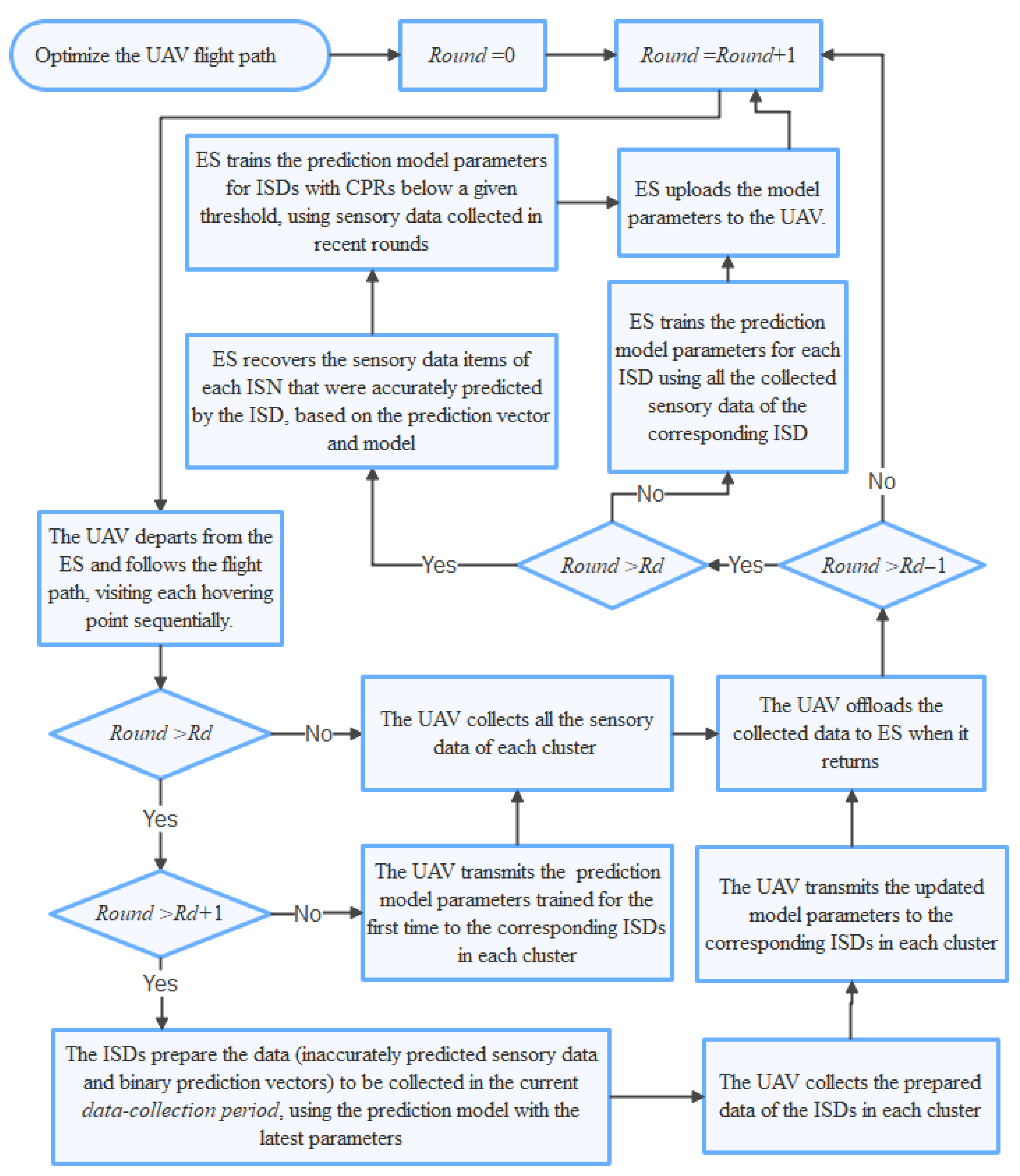 - A Novel System-Level Collaborative Framework: The core contribution of this work is the proposal of DC-CSAP, a novel “Edge-UAV-End” system architecture and orchestration framework for the UAV-assisted IoT. Its novelty lies not in inventing new prediction or path-finding algorithms from scratch, but in integrating and coordinating established components (edge intelligence, UAV mobility, and predictive sampling) into a cohesive workflow that overcomes the limitations of existing two-party (UAV-node) models. We formally define and implement four dedicated collaboration mechanisms (ES-UAV, ES-ISN, UAV-ISN, and Inter-ISN) that enable this synergy.