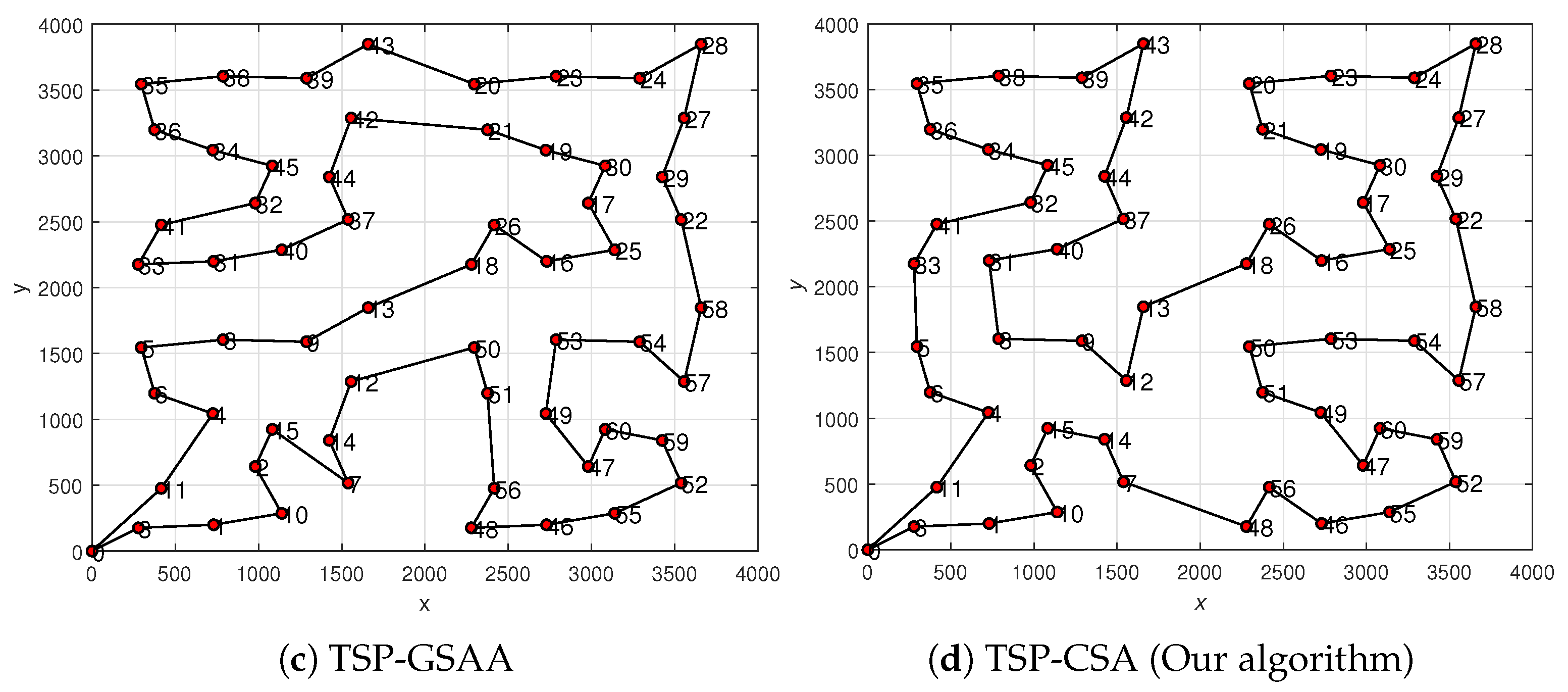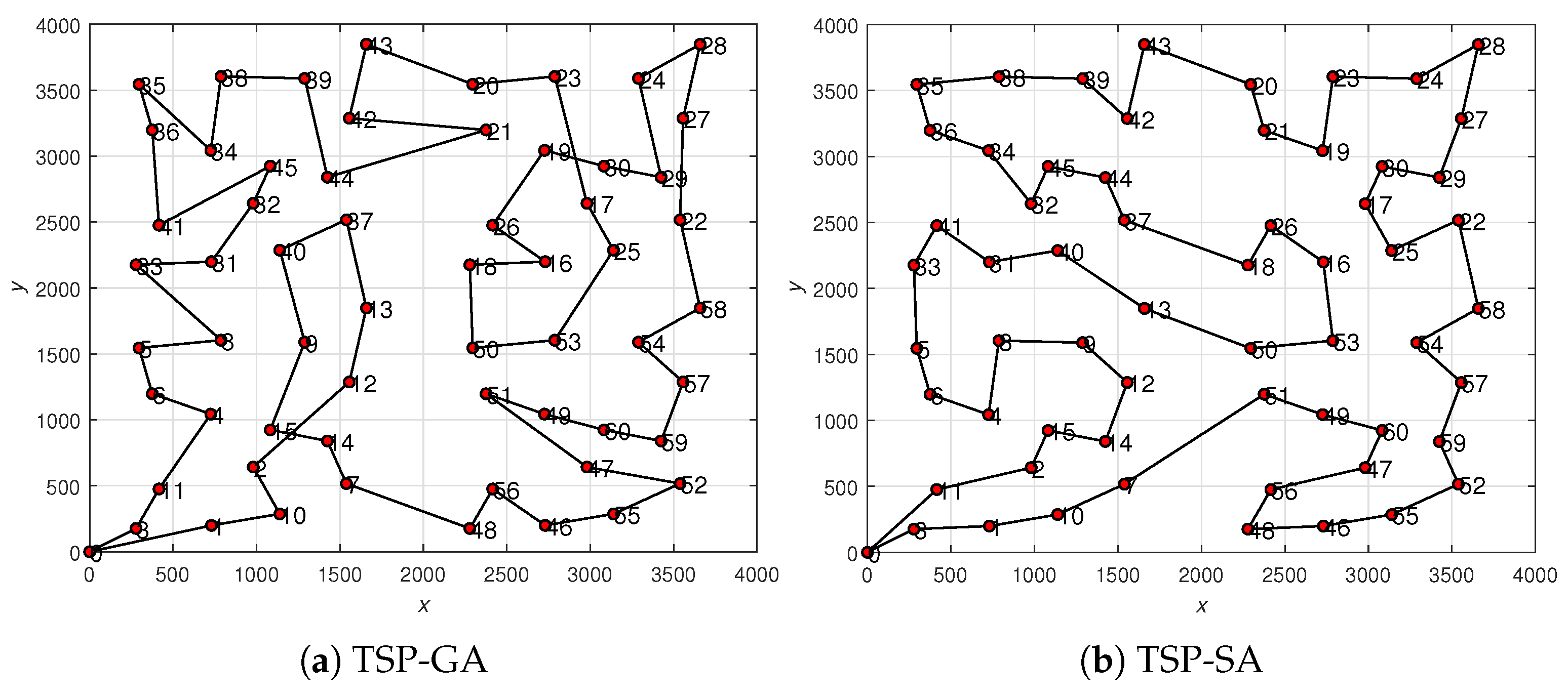 | TSP-GSAA [30] | A hybrid metaheuristic combining GA’s global search with SA’s local optimization. The algorithm maintains a population in which each individual undergoes SA-based refinement. |