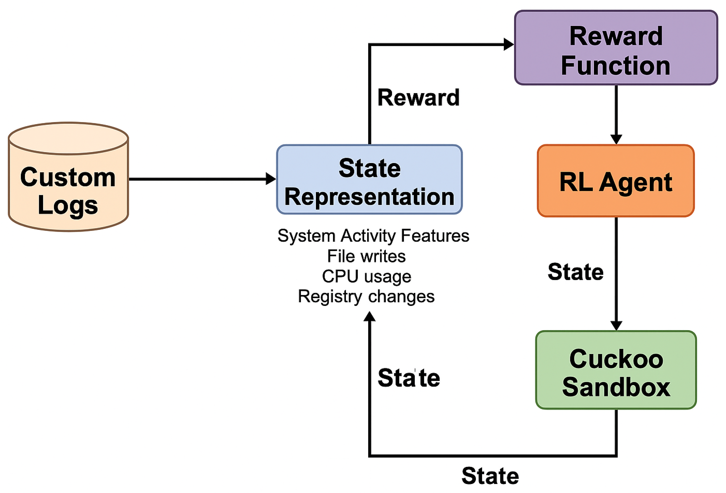 32]. Our proposed framework introduces an RL agent that learns directly from environment observations by mapping behavioral features—such as file system operations, registry access, and CPU usage—into a structured state space. The agent interacts with a virtual sandbox, receives positive reward for correct blocks and negative reward for delayed or missed actions, and continuously updates its Q-values or policy networks [