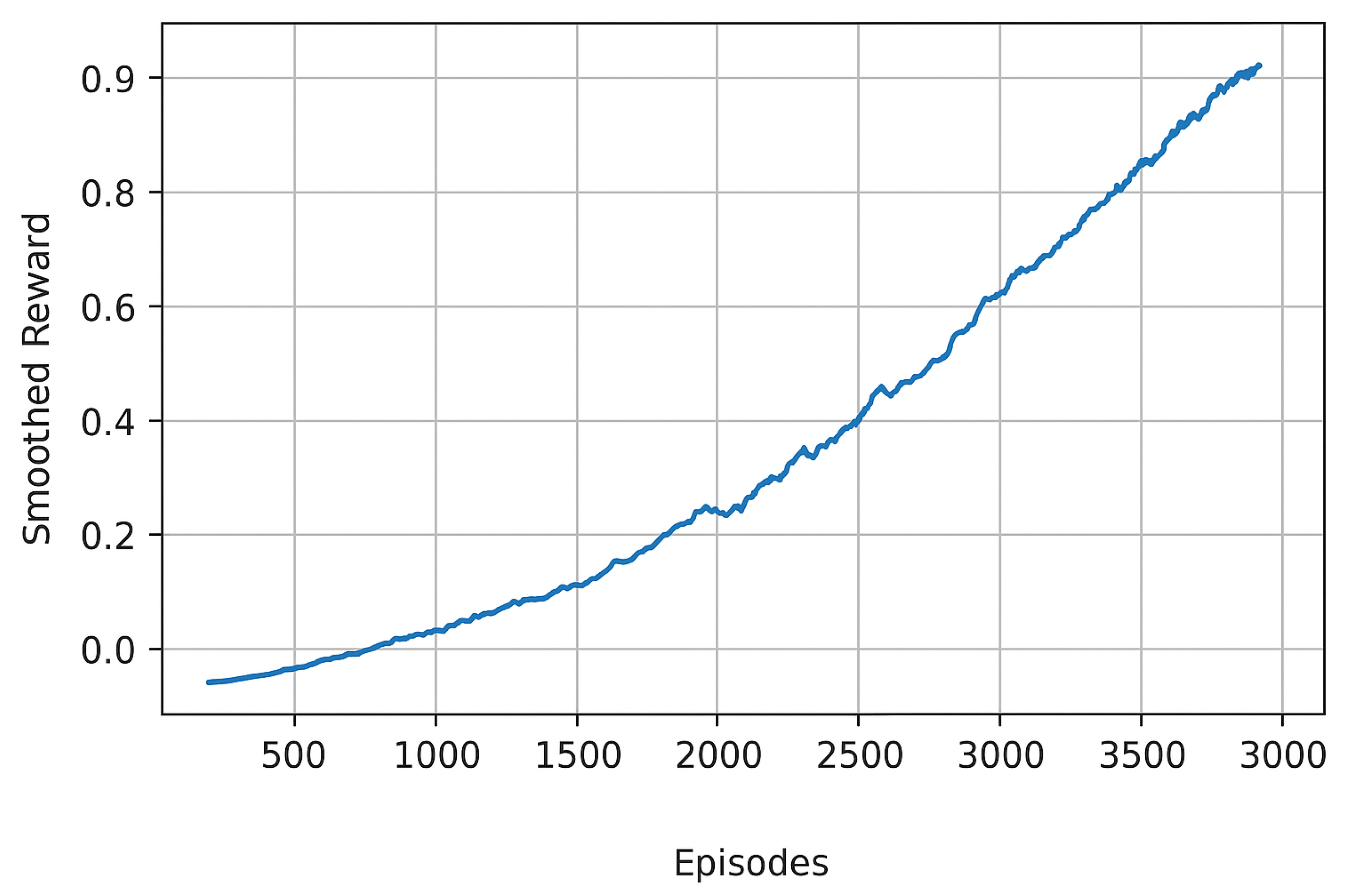 Figure 2 illustrates the learning progression of the (RL) agent over 3000 episodes, with rewards smoothed using an exponential moving average to reduce variance caused by exploratory actions. The consistent upward trajectory indicates that the agent increasingly learned to make optimal decisions in the environment, successfully distinguishing between ransomware-like and benign behaviors. Initially, the reward remained near zero, reflecting the agent’s trial-and-error exploration. As training progressed, the agent began to exploit more effective policies, leading to a steady improvement in cumulative reward. The curve’s smooth and monotonic rise suggests stable convergence, robust policy refinement, and reliable generalization across diverse behavioral patterns encountered during training.