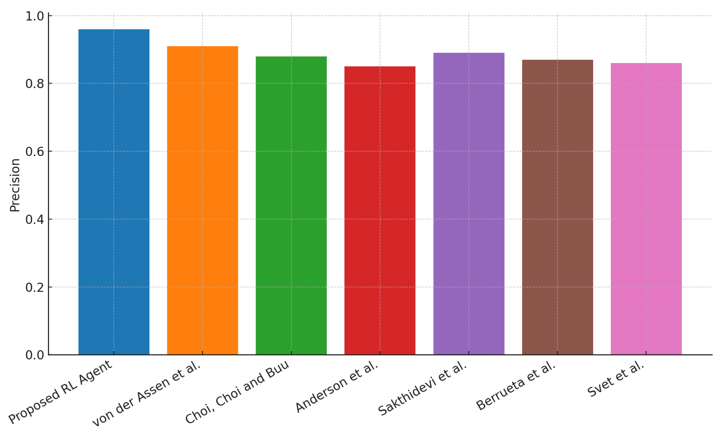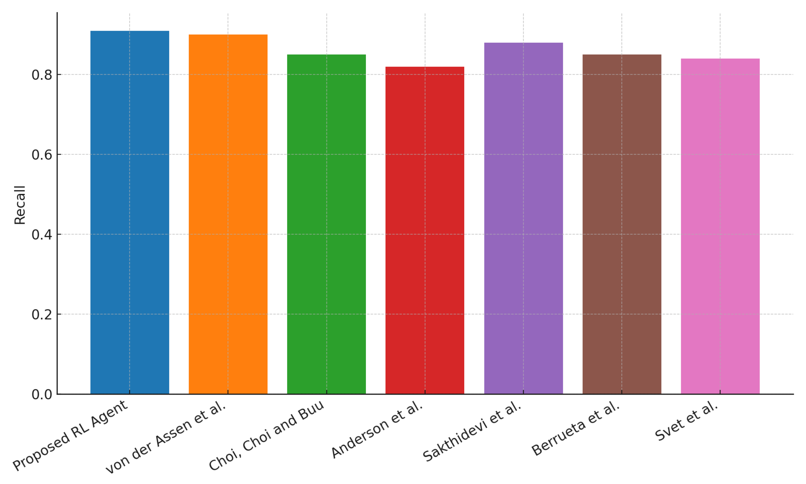 Figure 4 presents the precision comparison, illustrating how accurately each model identified ransomware samples without misclassifying benign processes. The proposed RL agent achieved the highest precision at 0.96, outperforming all baseline models, including von der Assen et al. at 0.91 and Sakthidevi et al. at 0.89. This indicates that the proposed agent produces fewer false positives, which is crucial in reducing unnecessary disruptions in benign software execution. The high contrast in the bar heights also reflects the agent’s ability to isolate decisive features associated with ransomware without being overly sensitive to benign anomalies.