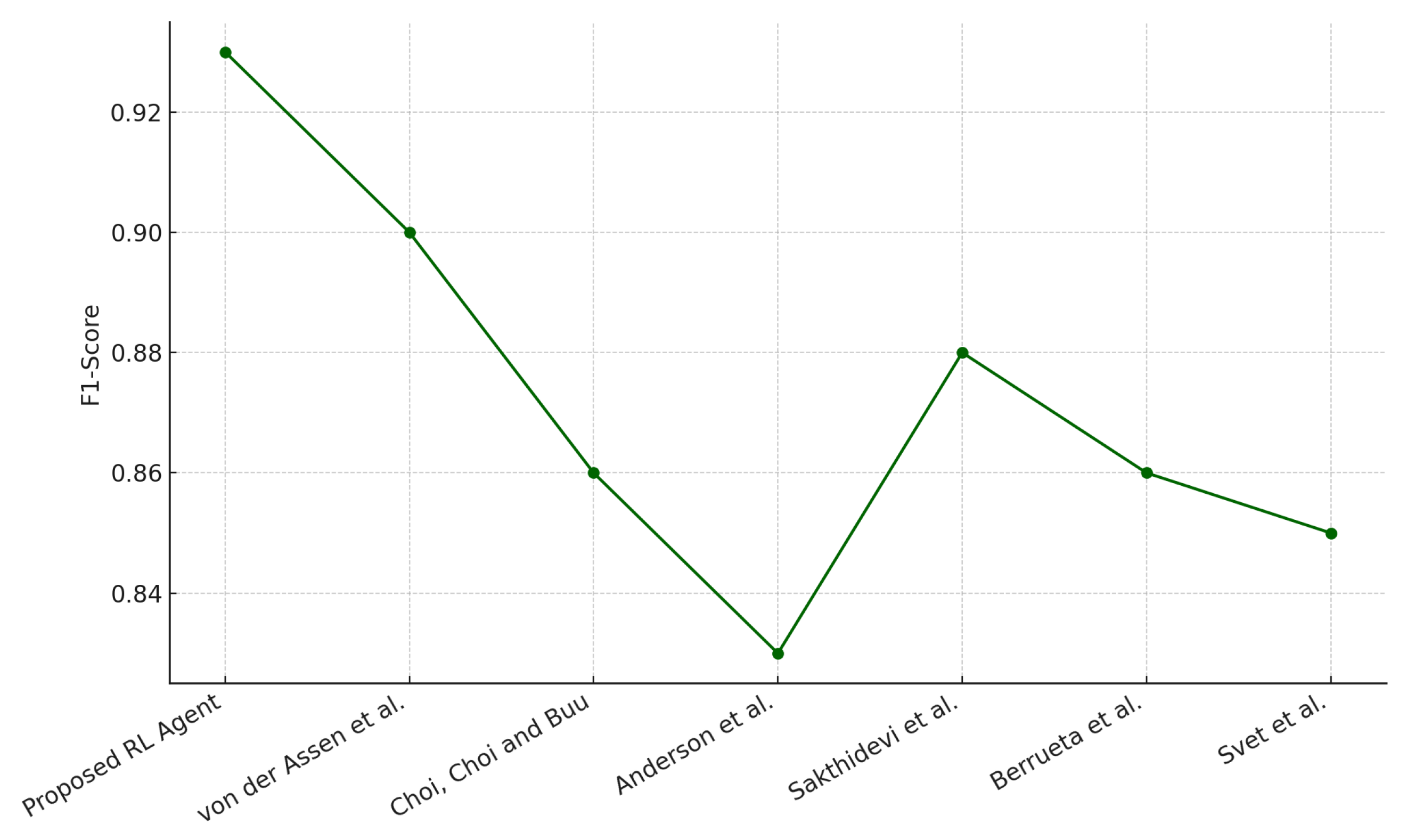 Figure 6 compares the F1-scores of various ransomware detection methods, highlighting the performance balance between precision and recall. The proposed RL-based model achieved the highest F1-score of 0.93, indicating superior consistency in detecting ransomware with minimal false positives and false negatives. In contrast, Anderson et al. [