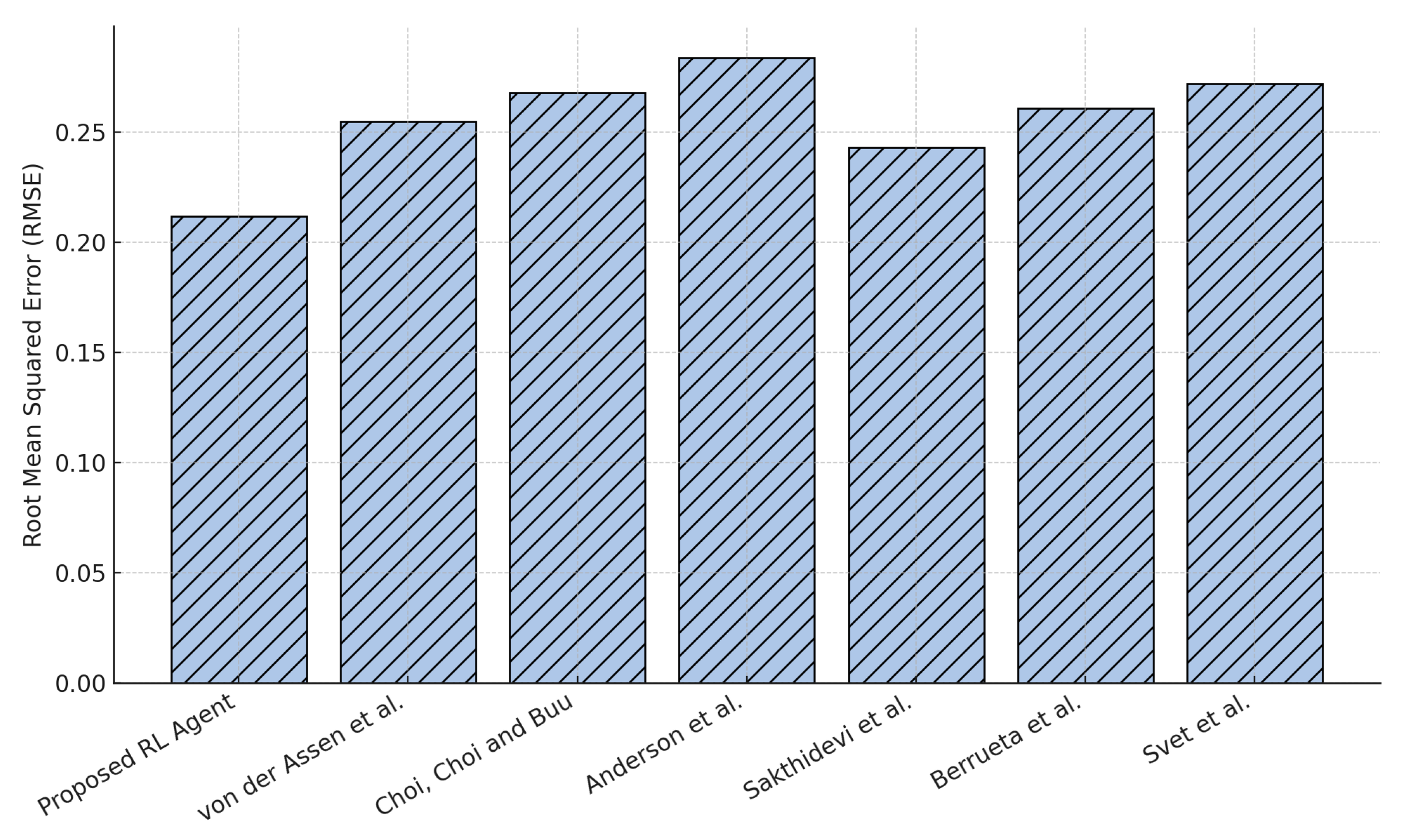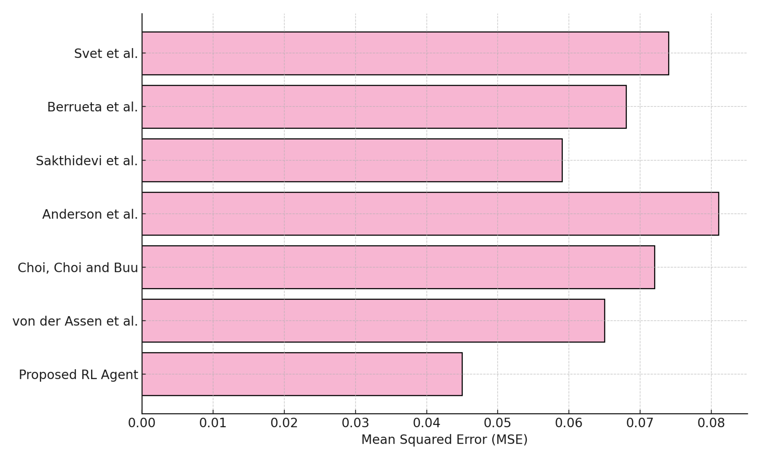Figure 7 illustrates the mean squared error (MSE) values for all compared models using a horizontal bar plot. The proposed (RL) model achieved the lowest MSE at 0.045, confirming its high fidelity in decision accuracy during both training and inference. The closest competitor, Sakthidevi et al. [