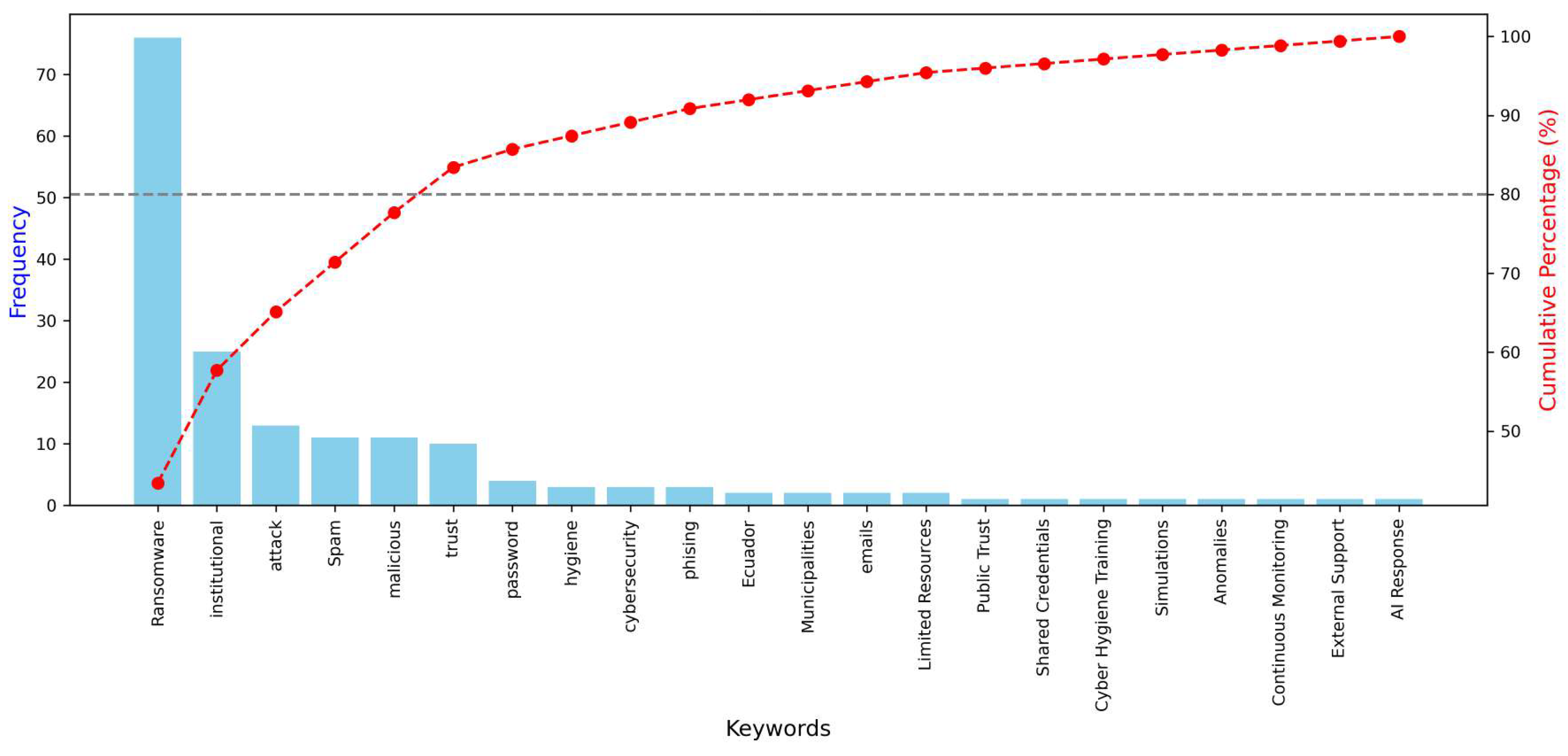 Figure 4 presents a Pareto analysis of the interview keywords, where the bars represent absolute frequencies and the red line illustrates the cumulative percentage. The six dominant terms—Ransomware (76), Phishing (25), Weak Passwords (13), Spam (11), Resilience (11), and Ecuador (10)—collectively exceed 80% of all coded mentions, evidencing that a small set of concepts concentrates the majority of the discourse.