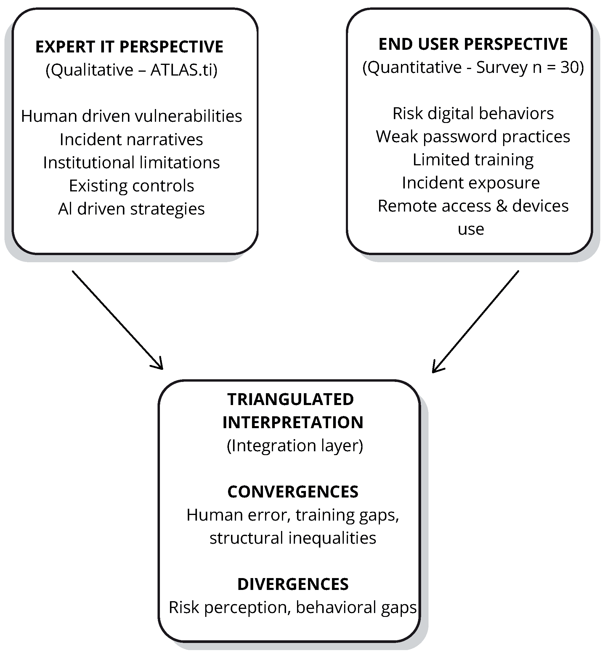 It is important to clarify that the qualitative thematic analysis strictly relied on interviews with ten expert participants occupying technical and strategic roles in municipal cybersecurity. The inclusion of non-technical end users was designed as a complementary component for triangulation purposes and was not part of the formal thematic coding process.