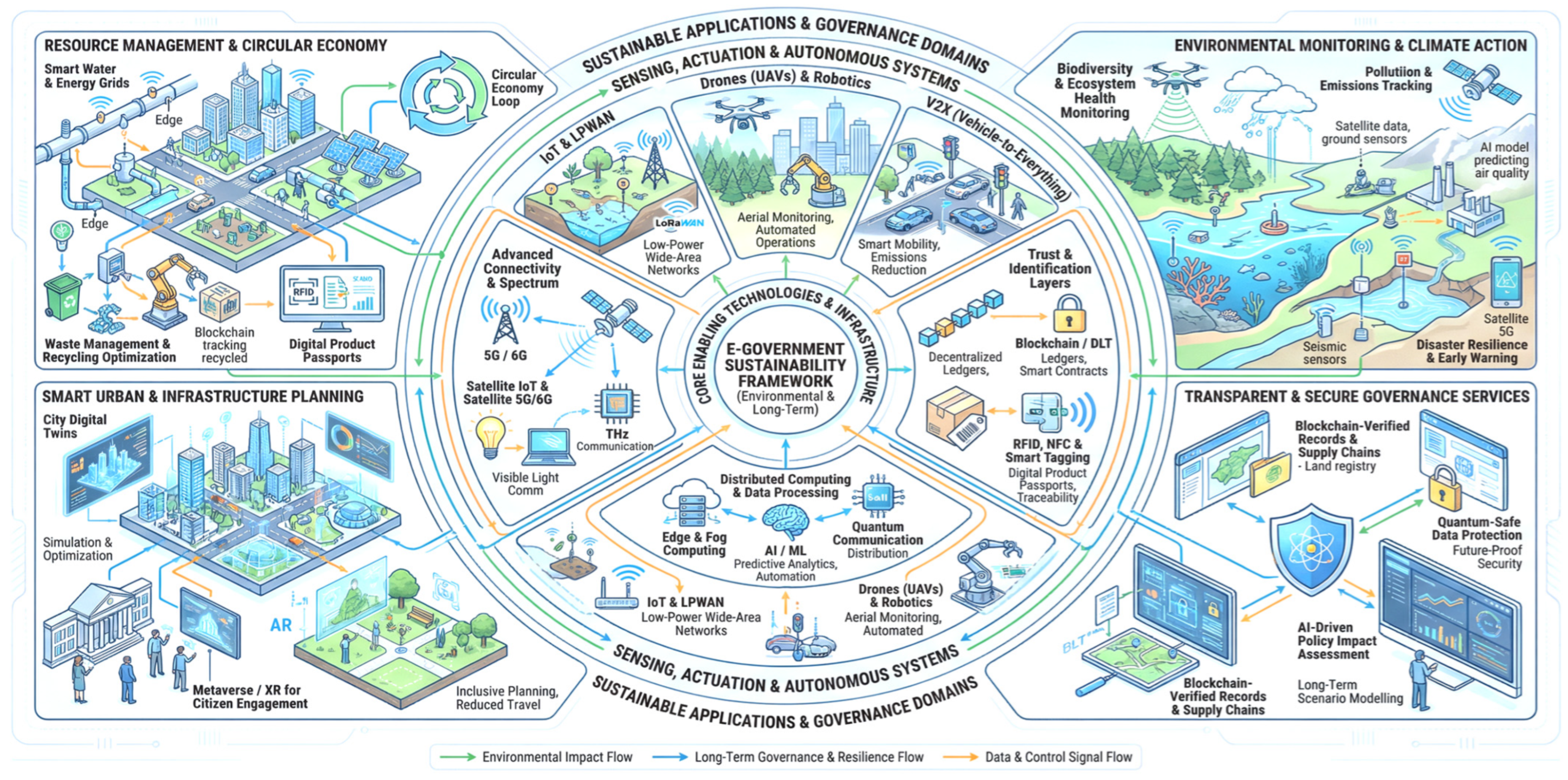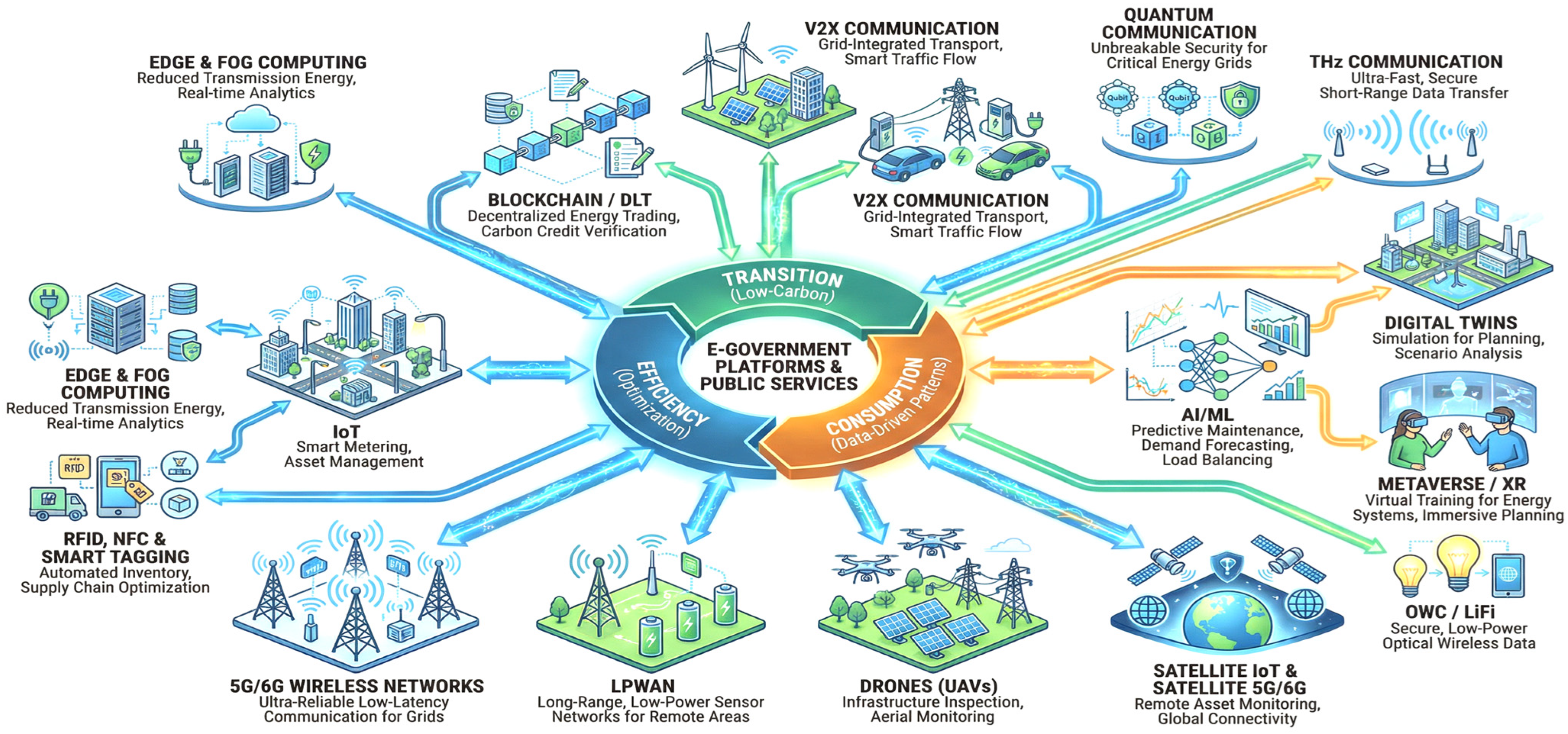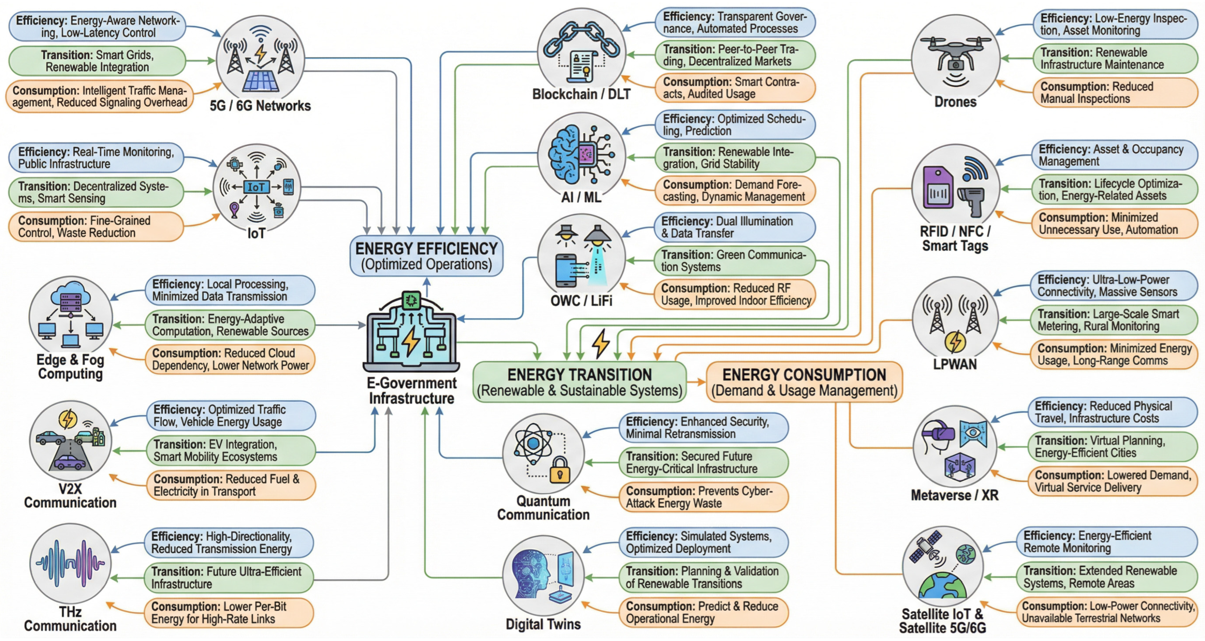 - Finally, this work reviews and synthesizes the literature to propose a collaborative technical e-government technique. The framework shows how coordinated technology deployment can support service automation, cybersecurity, sustainable energy management, and smart city development by systematically integrating wireless networks, IoT, AI, edge–cloud computing, blockchain, and advanced communication paradigms. This conceptual technique provides a structured reference model for developing scalable, secure, energy-efficient e-government ecosystems that promote interoperability, resilience, and sustainability.