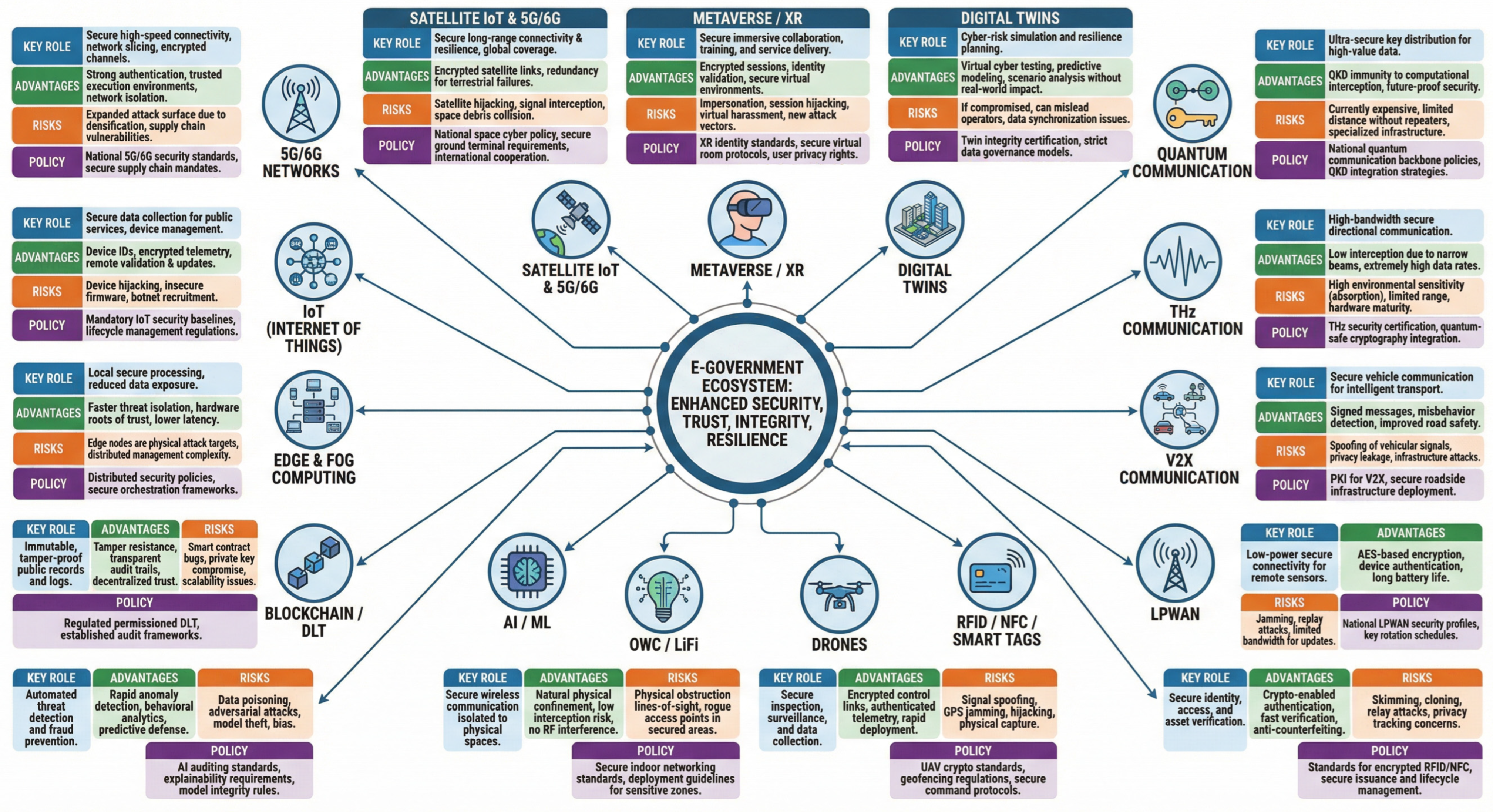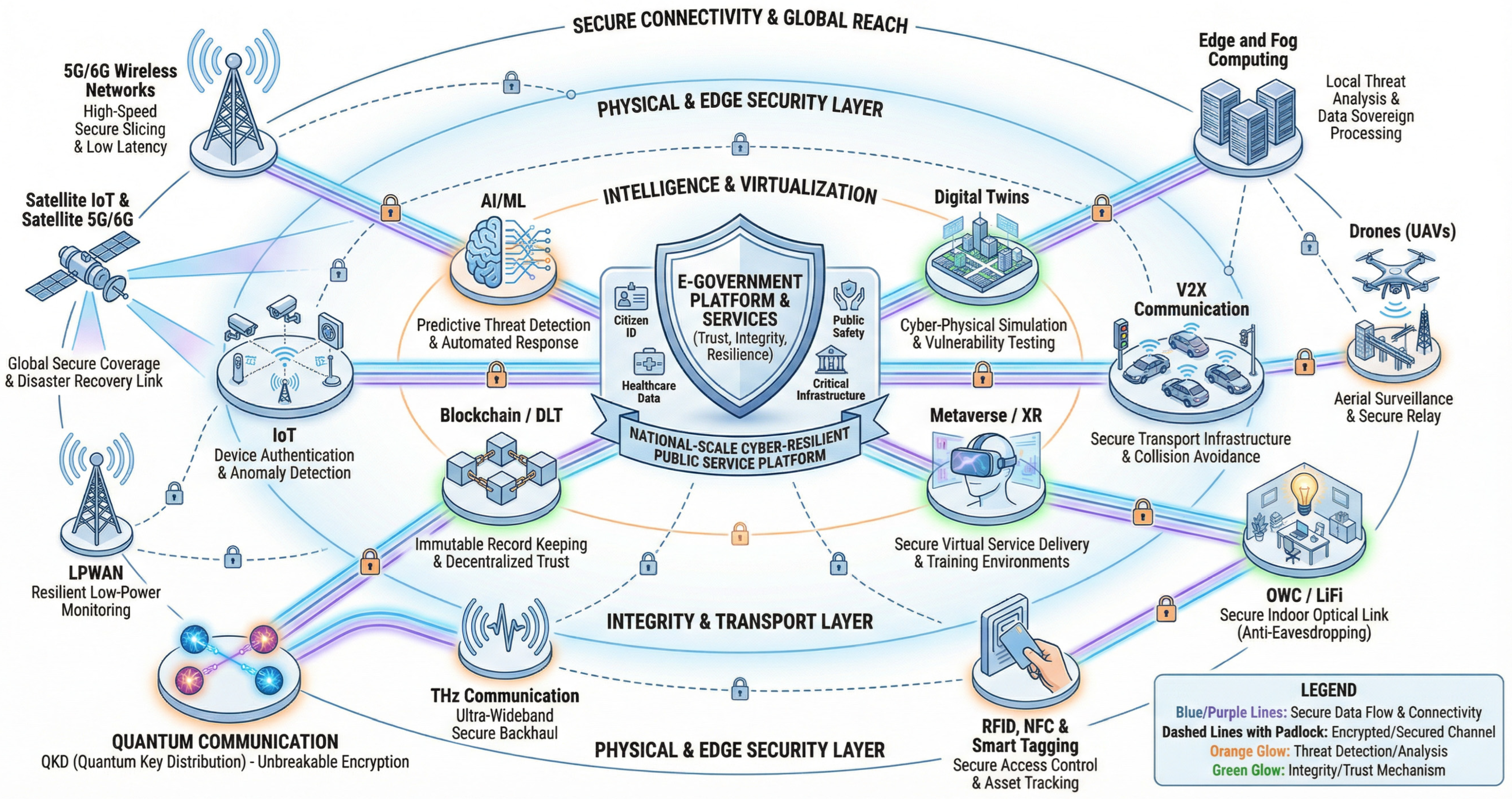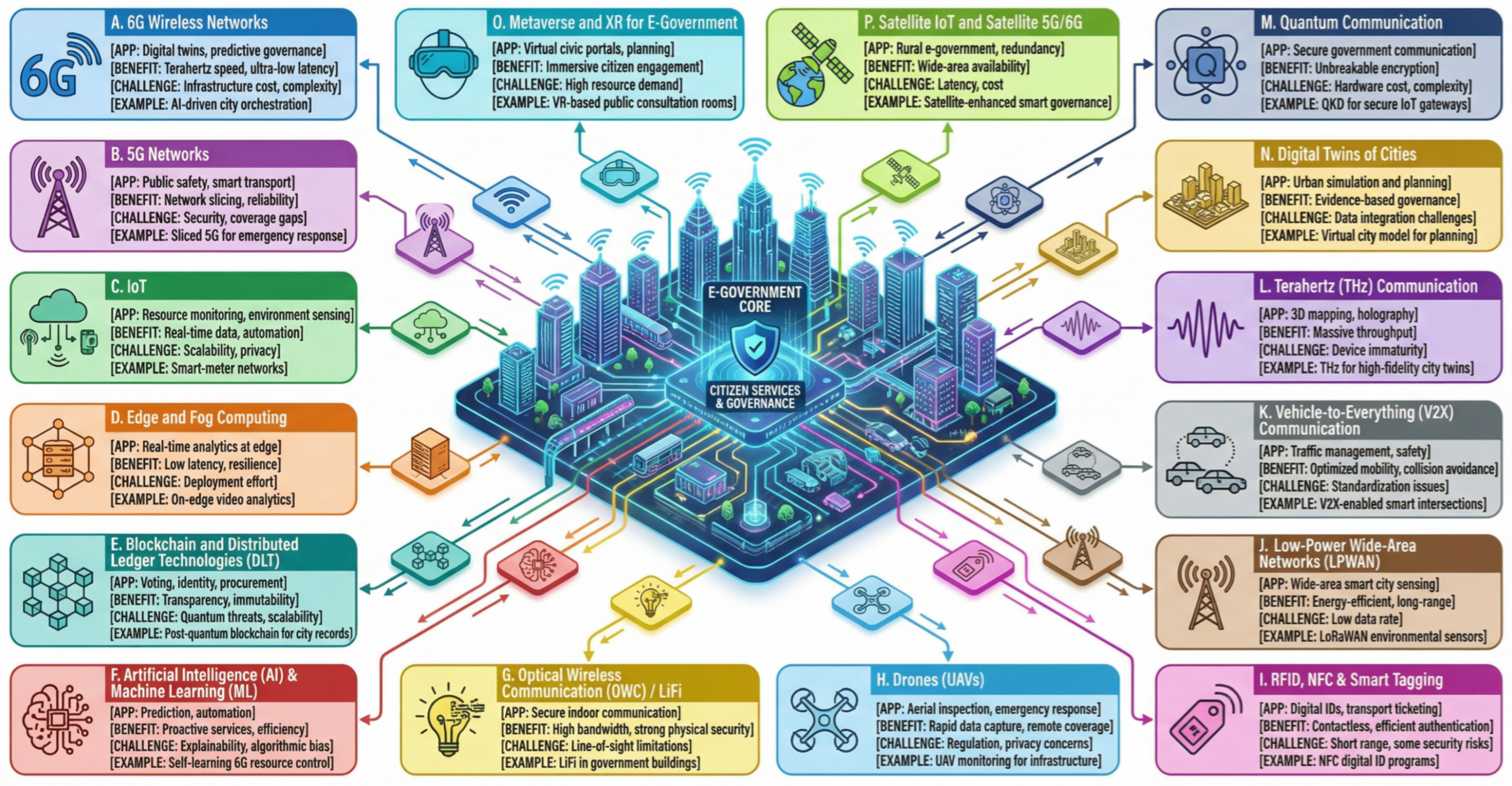 - Finally, this work reviews and synthesizes the literature to propose a collaborative technical e-government technique. The framework shows how coordinated technology deployment can support service automation, cybersecurity, sustainable energy management, and smart city development by systematically integrating wireless networks, IoT, AI, edge–cloud computing, blockchain, and advanced communication paradigms. This conceptual technique provides a structured reference model for developing scalable, secure, energy-efficient e-government ecosystems that promote interoperability, resilience, and sustainability.