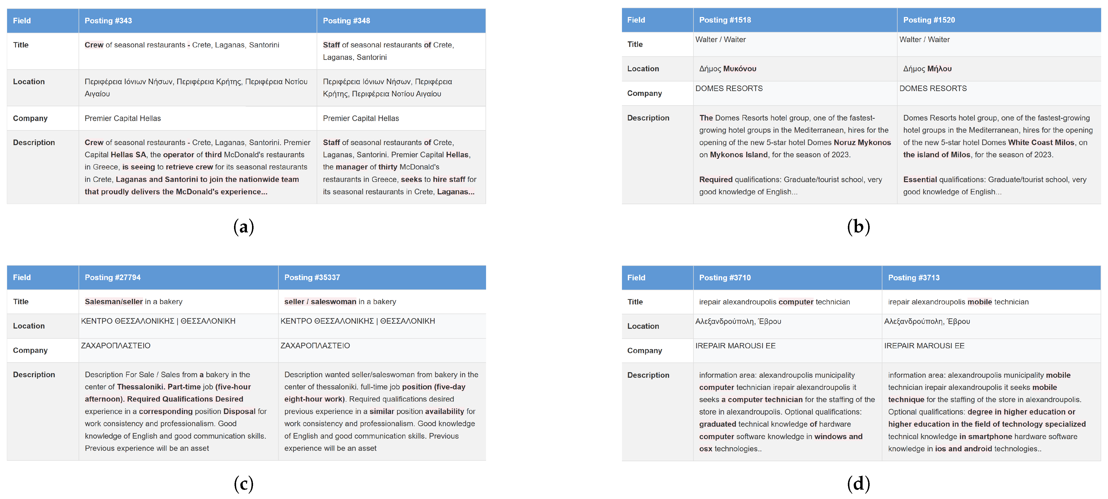 - However, role differences (e.g., job titles, required qualifications, role levels) and location differences must always be treated as meaningful and should result in the job postings being classified as distinct opportunities, even if all other fields are identical.