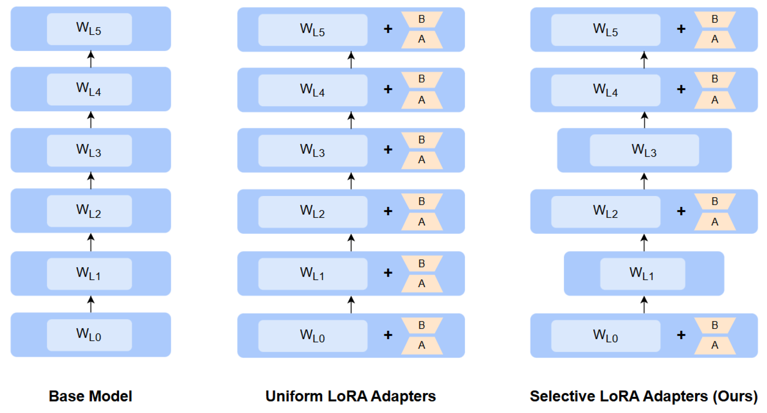 Selective LoRA schematic diagram. (Left): Base model, (Center): LoRA adapters applied uniformly to all layers, (Right): LoRA adapters applied to selected layers guided by activation norms.