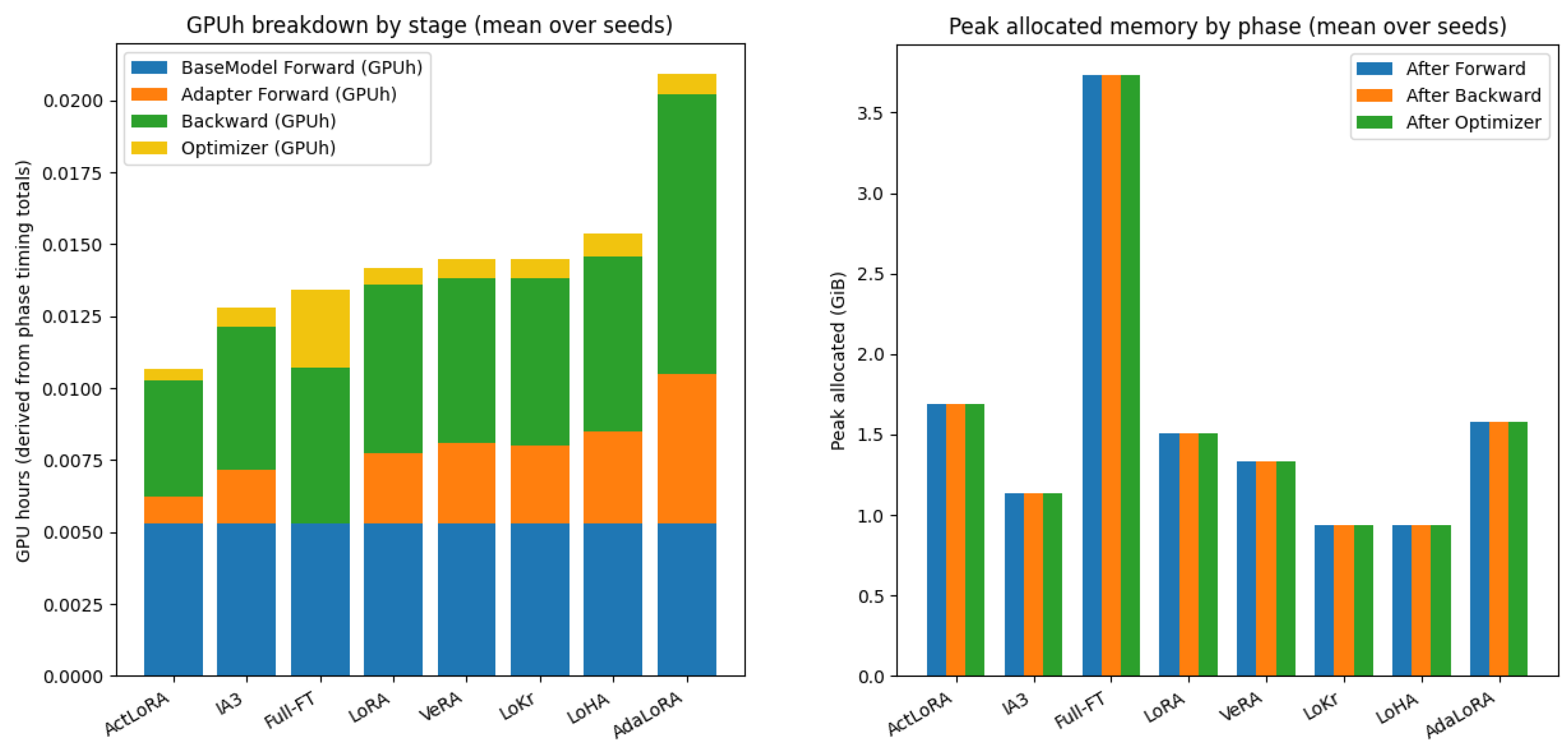 Phase-wise GPU time and memory comparison with SOTA methods. (Left): Per-step training time decomposed into forward, backward, and optimizer phases. (Right): GPU memory usage measured after forward, backward (peak), and optimizer phases.