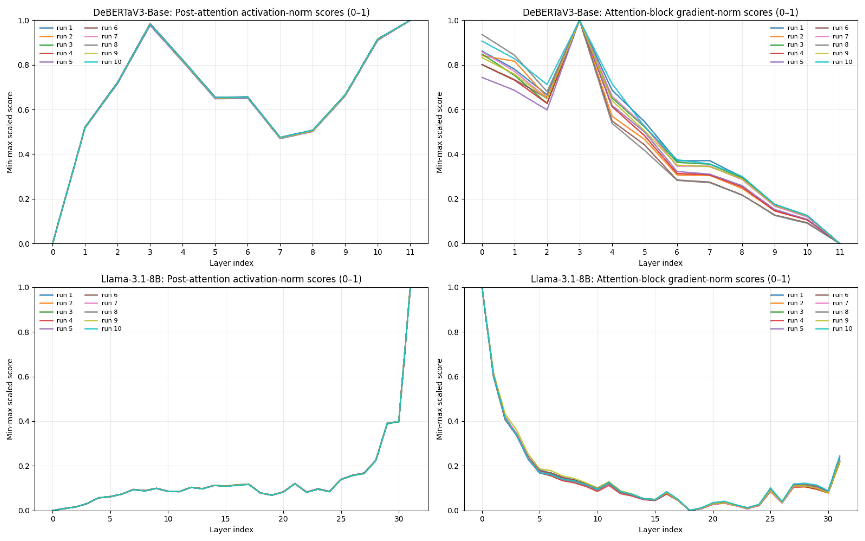 Comparison of activation norm and gradient norm-based layer importance for DeBERTaV3-Base and Llama-3.1-8B across 10 seeds. (Top): DeBERTaV3-Base. (Bottom): LLama-3.1-8B.