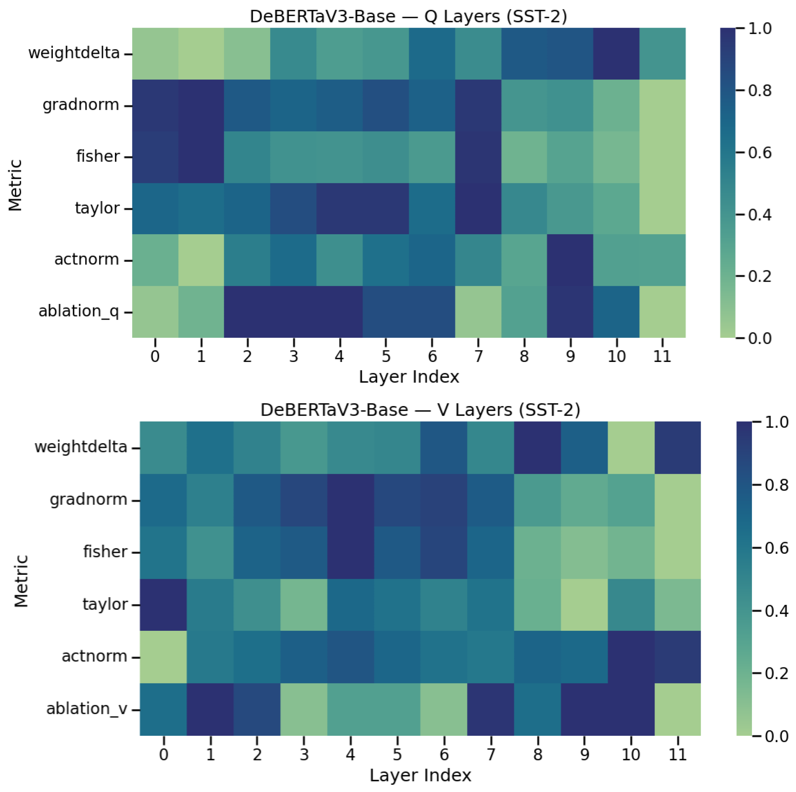 Comparison of layer importance for Q and V projections using various metrics.