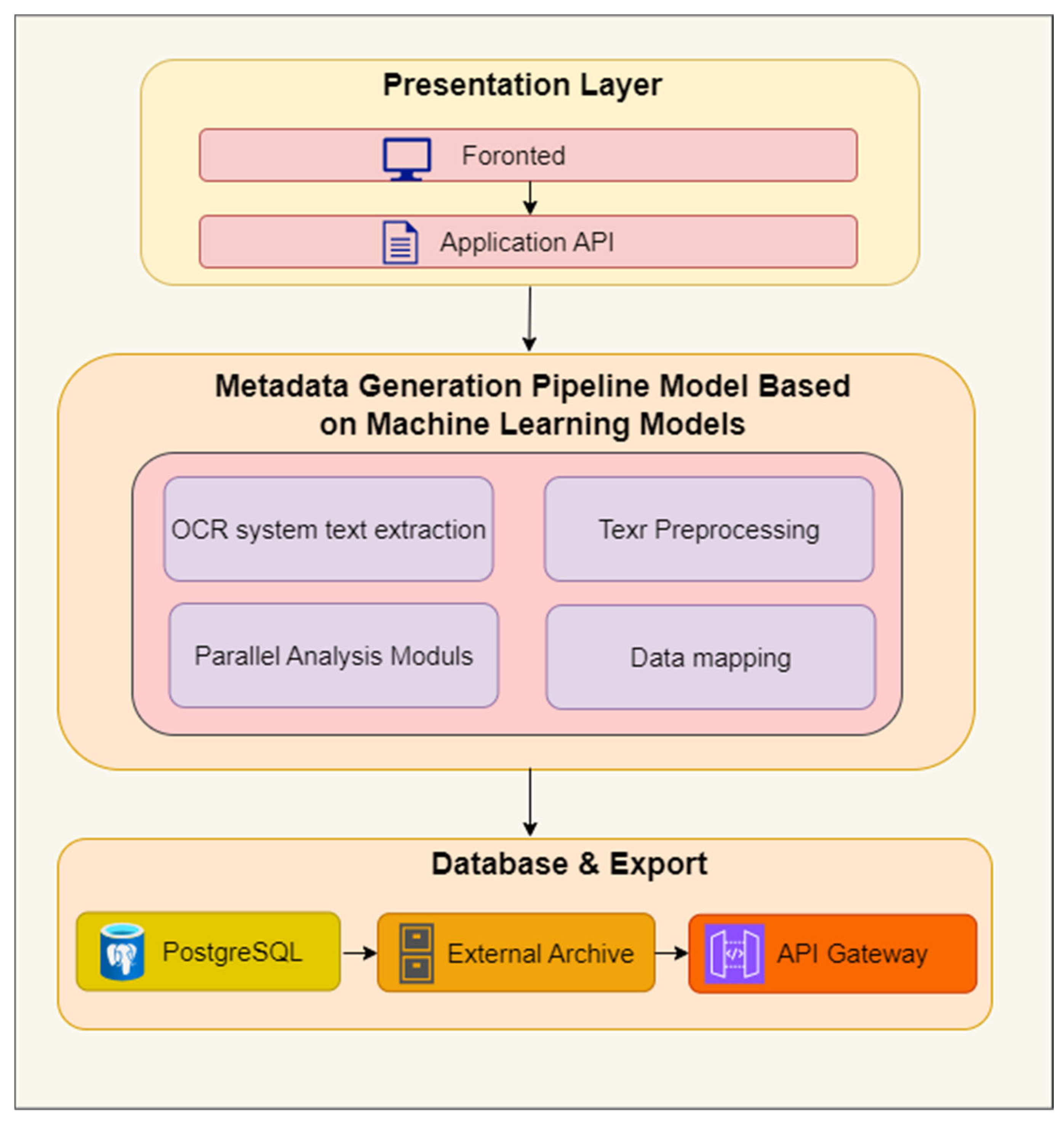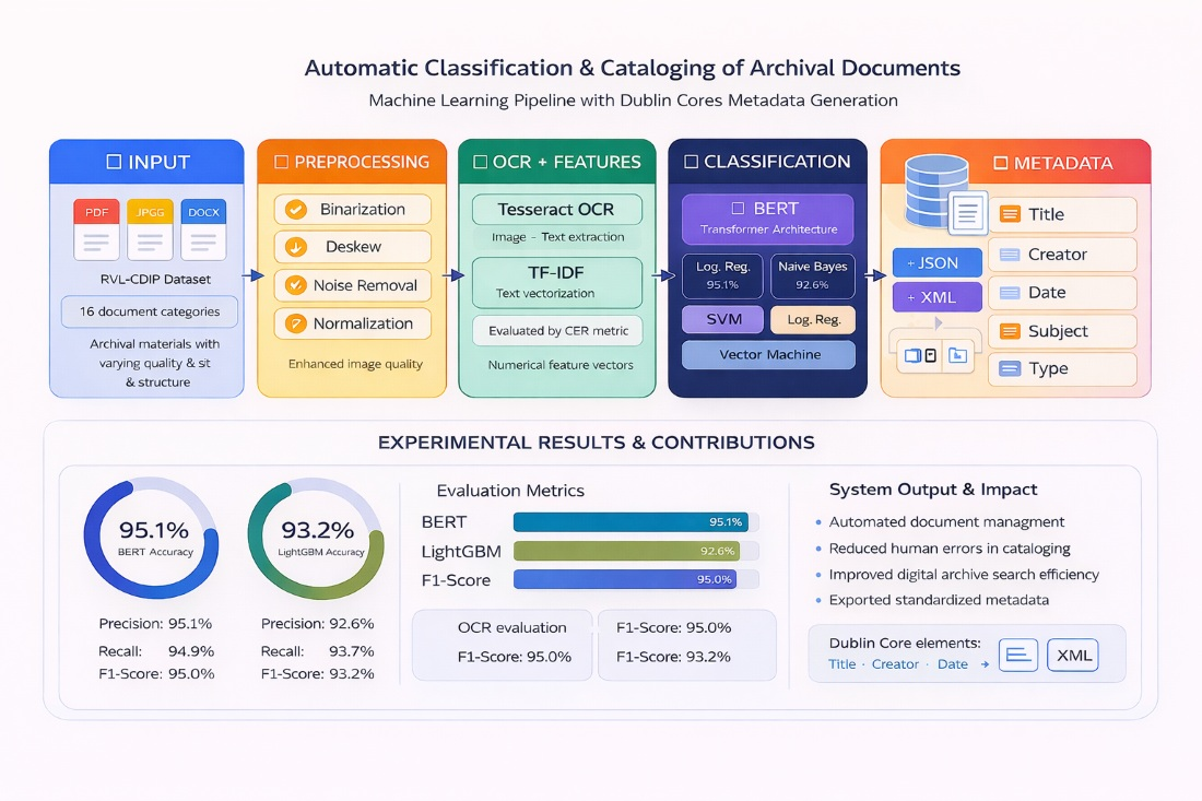 However, much research in this area has focused on individual components of the document processing process, such as optical character recognition (OCR), text classification, or metadata extraction. These approaches have often been developed as stand-alone tools and have not been sufficiently integrated into a single integrated system for use in archival environments. In addition, while most existing research has focused on improving classification accuracy, the integration of document classification with the automatic generation of standard metadata models used in digital archives has not been sufficiently explored. As a result, practical solutions that combine document recognition, classification, and metadata generation into a single, scalable, and scalable workflow that is compatible with real archival information systems are still lacking.