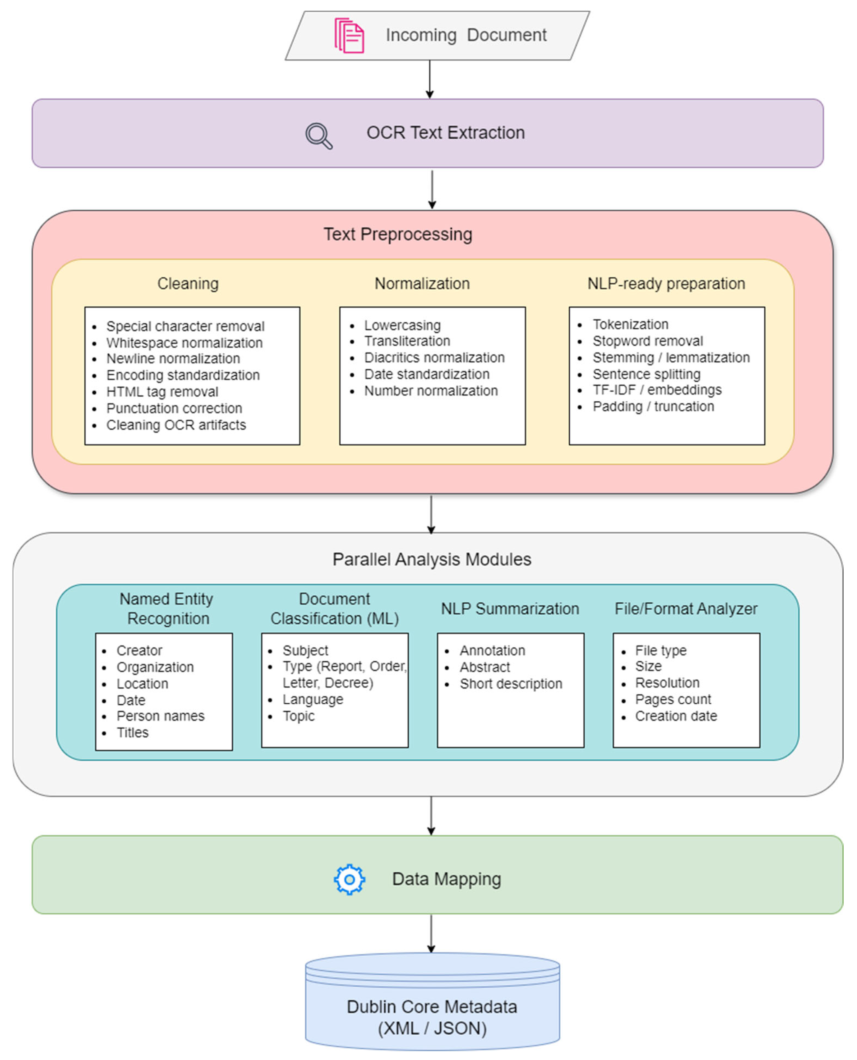 This section describes in detail the working principle of the proposed system for automatic document analysis, classification, and generation of metadata based on the Dublin Core standard. The system includes all stages, including receiving incoming documents (PDF, JPG, DOCX), converting them to text using OCR, text cleaning and processing, analysis based on machine learning and natural language processing methods, and finally generating a standardized metadata record.