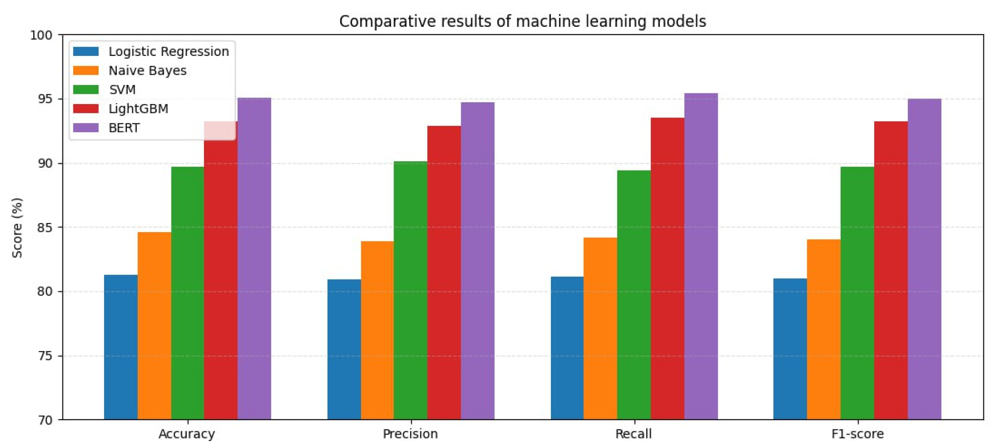 In order to systematically evaluate these trends, the results of the models were presented in a visual form in terms of accuracy, recall, and F1-score. The comparative histogram clearly shows the superiority of the BERT and LightGBM models, as well as the effectiveness of classical algorithms on simpler tasks. The diagram shows that modern transformer-based approaches (BERT) and ensemble models (LightGBM) provide the highest efficiency when working with complex and noisy text data.