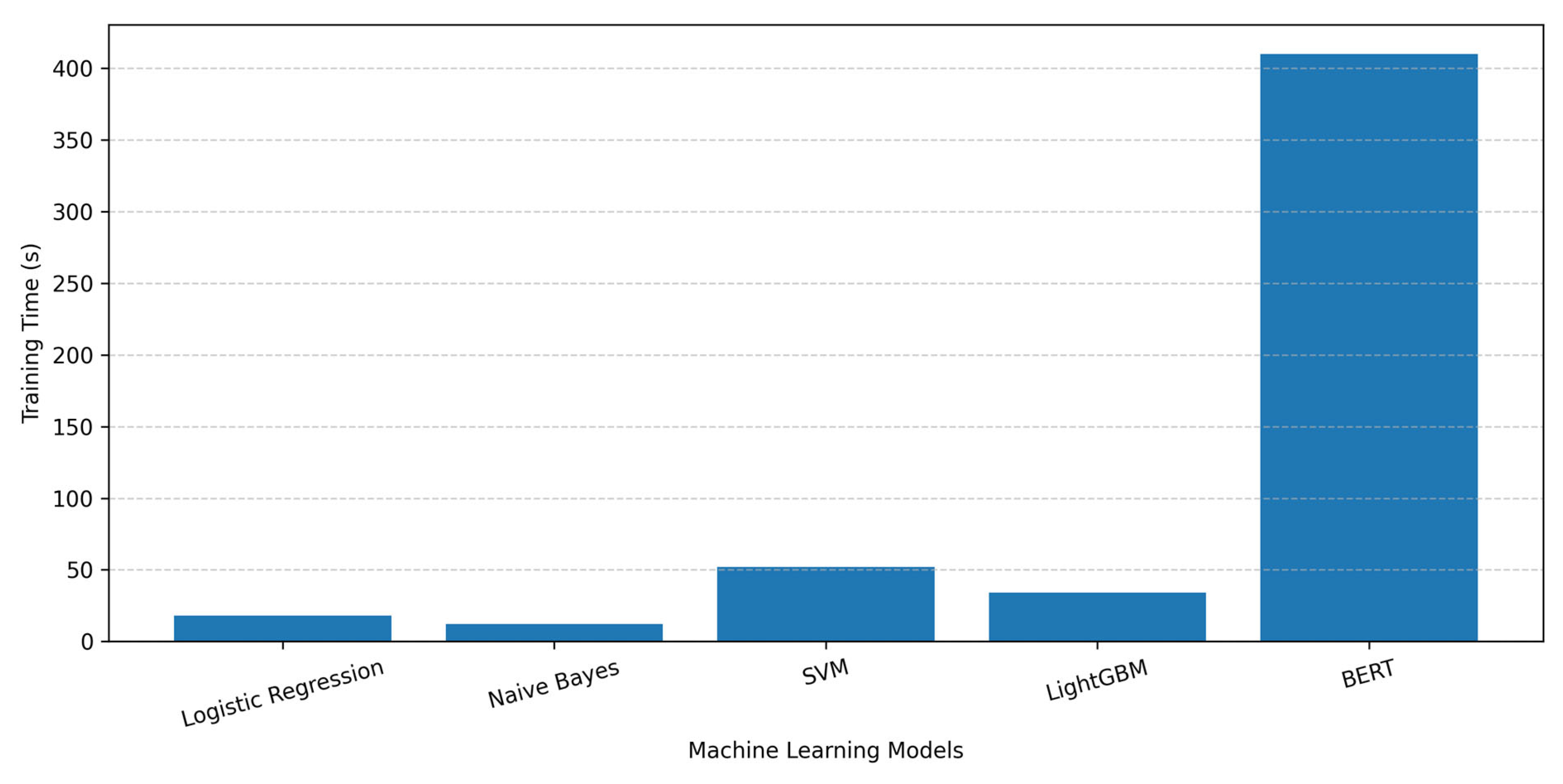 However, this improvement in accuracy comes at the cost of significantly higher computational complexity, as reflected by the longer training time (410 s). These results highlight the trade-off between computational efficiency and classification performance. While classical models remain useful as baseline approaches, LightGBM offers a practical compromise, and BERT provides the highest accuracy for applications requiring deeper semantic analysis.