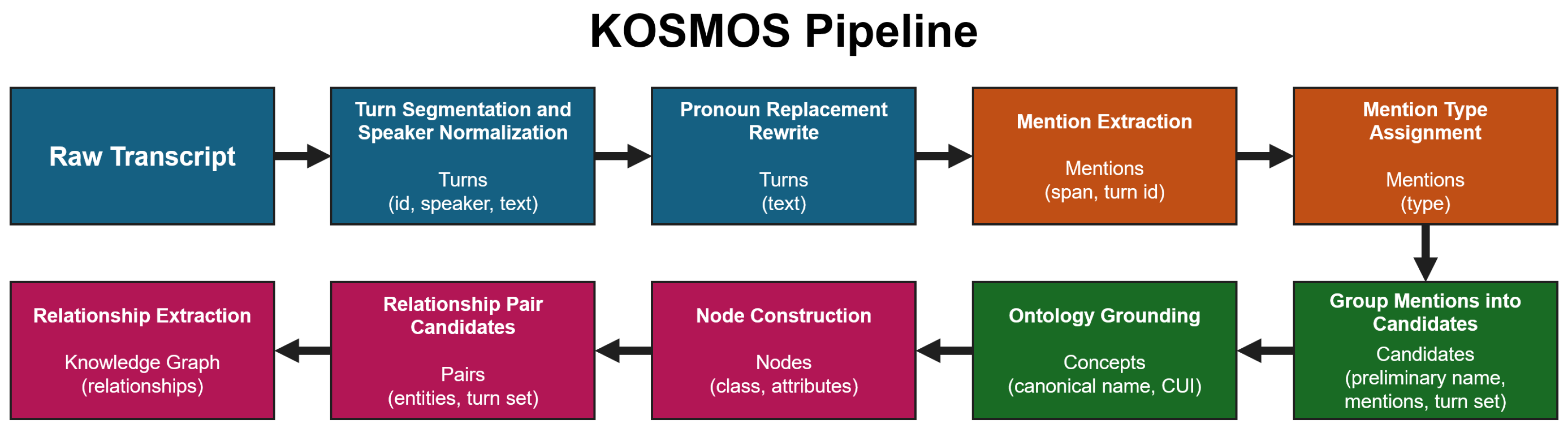 Overview of the Knowledge graph Ontology Supported Medical Output System (KOSMOS) process. A raw transcript is first pre-processed to add turn labels and make the language more clear. Then it identifies clinically relevant mentions and assign each a type (e.g., problem, activity, medication, lab test, measurement). Mentions are then consolidated into canonical concepts that aggregate evidence across turns. Finally, the resulting concepts converted into nodes and are connected into a knowledge graph using typed, directed relationships to represent the encounter as an explicit set of entities and relations. The square brackets “[]” refer to what transcript turn the transcript or mention comes from. The curly braces “{}” refer to what set of transcript turns the concepts are derived from.