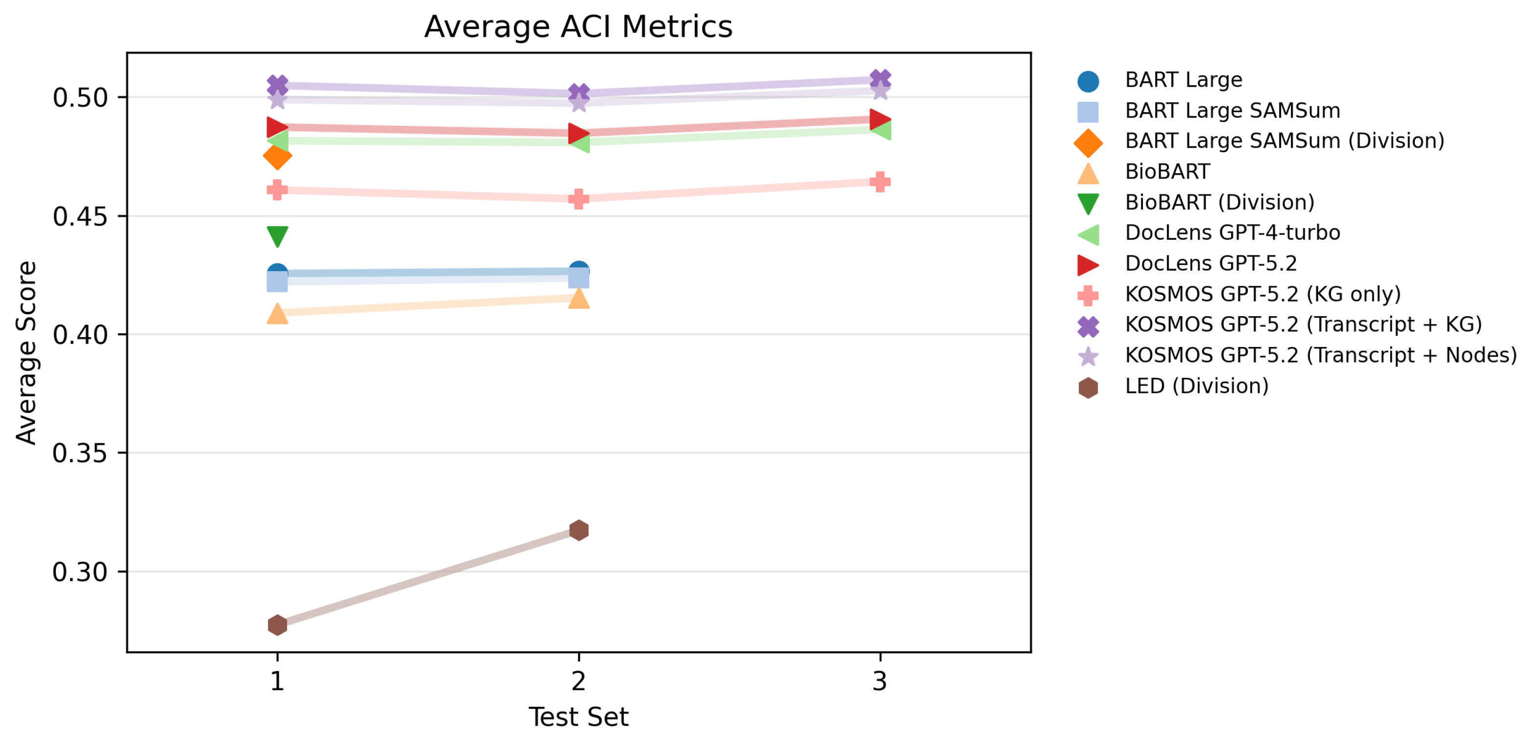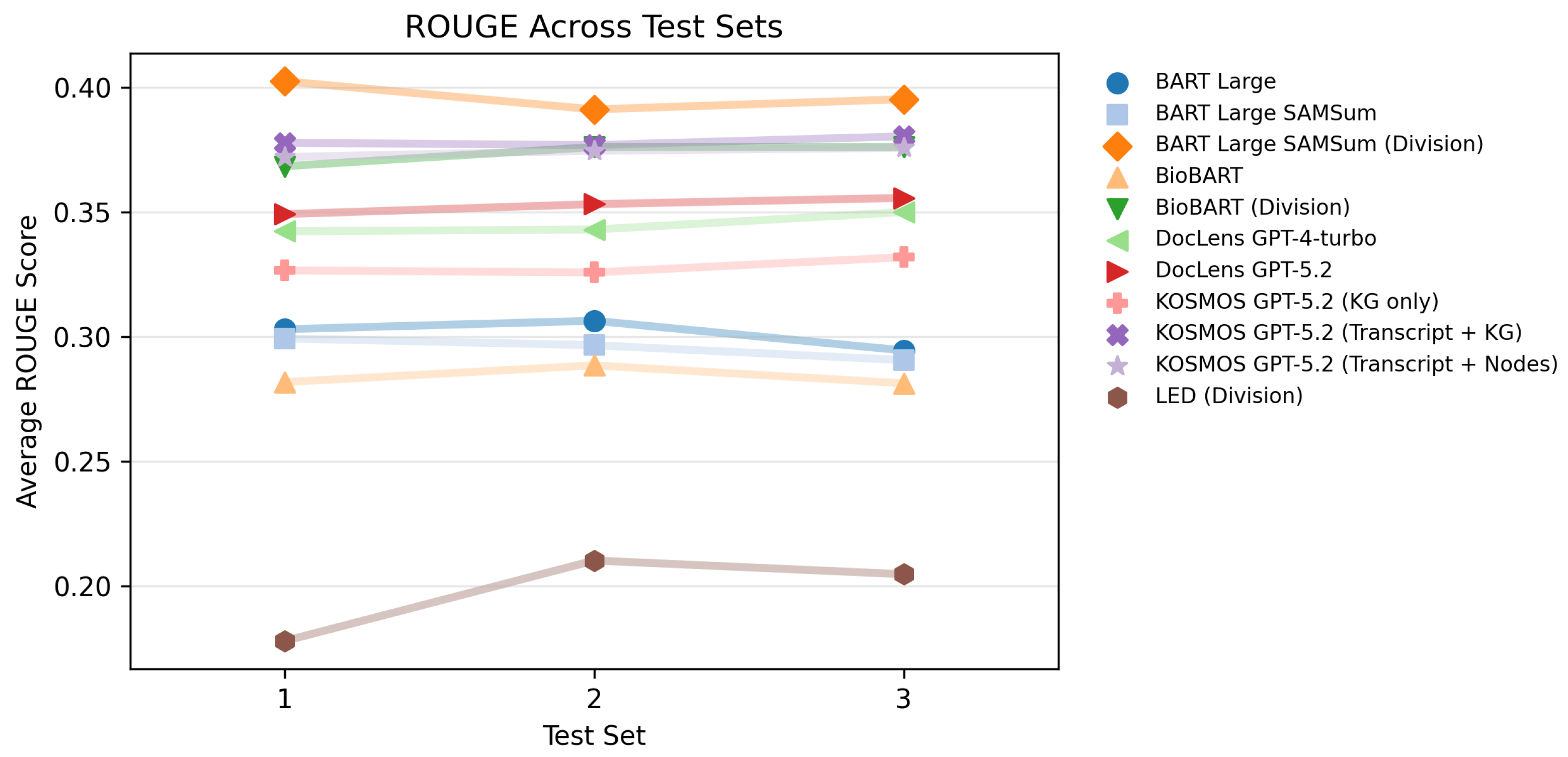 Average ROUGE scores across three ACI-BENCH test sets. Each value represents the mean of ROUGE-1, ROUGE-2, and ROUGE-Lsum, which measure n-gram overlap and sequence-level similarity between generated and reference notes. BART Large SAMSum (Division) achieves the highest overall ROUGE scores across all test sets. Our structured-context variants—KOSMOS GPT-5.2 (Transcript + Nodes) and KOSMOS GPT-5.2 (Transcript + KG)—consistently outperform the transcript-only DocLens baselines, demonstrating that incorporating extracted nodes or KGs improves summary fidelity.