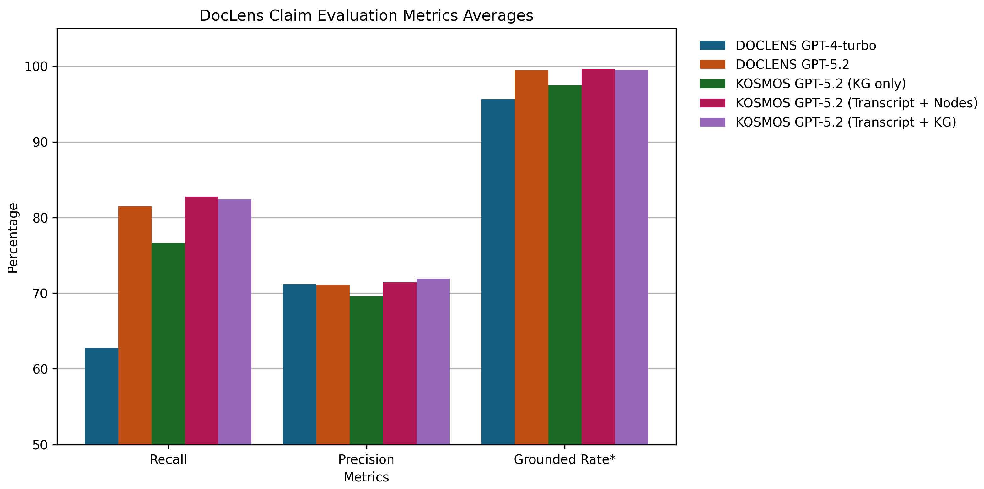 DocLens-style claim evaluation averages across models. Recall is the percentage of claims in the gold (reference) SOAP note that also appear in the generated SOAP note. Precision is the percentage of claims in the generated SOAP note that also appear in the gold SOAP note. Grounded Rate* is the percentage of generated claims whose that can be fully justified by the transcript without unsupported additions. KOSMOS GPT-5.2 (Transcript + Nodes) and KOSMOS GPT-5.2 (Transcript + KG) are nearly identical across all three metrics. Both are very close to DocLens GPT-5.2 in precision and grounding rate, while showing a slight edge in recall, suggesting improved coverage of gold claims without sacrificing support.